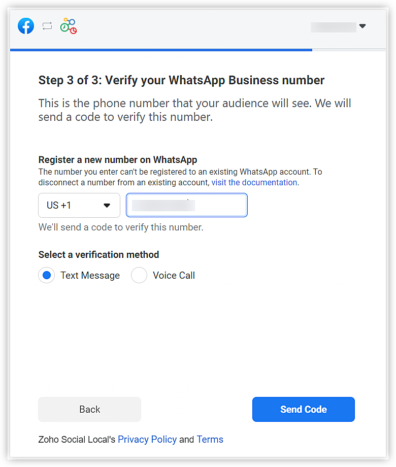 WhatsApp Businessプロフィールに関連付けられている電話番号を選択します。