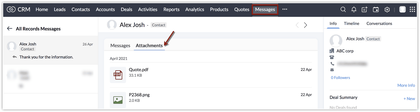 Zoho CRMの担当者は、メッセージにファイルを添付して送信できます。一度に添付できるファイルは5件までです。ファイルは以下のいずれかの場所から添付できます。