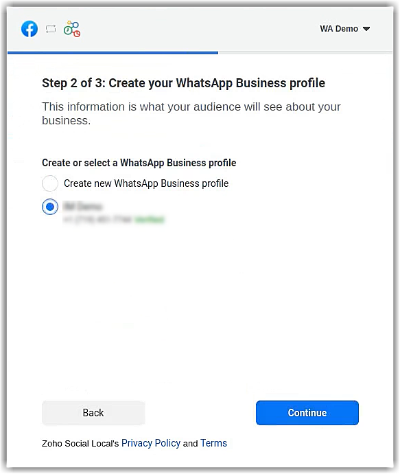 連携するWhatsApp Businessプロフィールを選択します。新しいプロフィールを作成することも可能です。