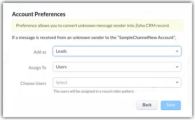 アカウントの各種設定の画面で、Zoho CRMに登録されていない相手とやりとりをした場合の情報の登録先を選択します。