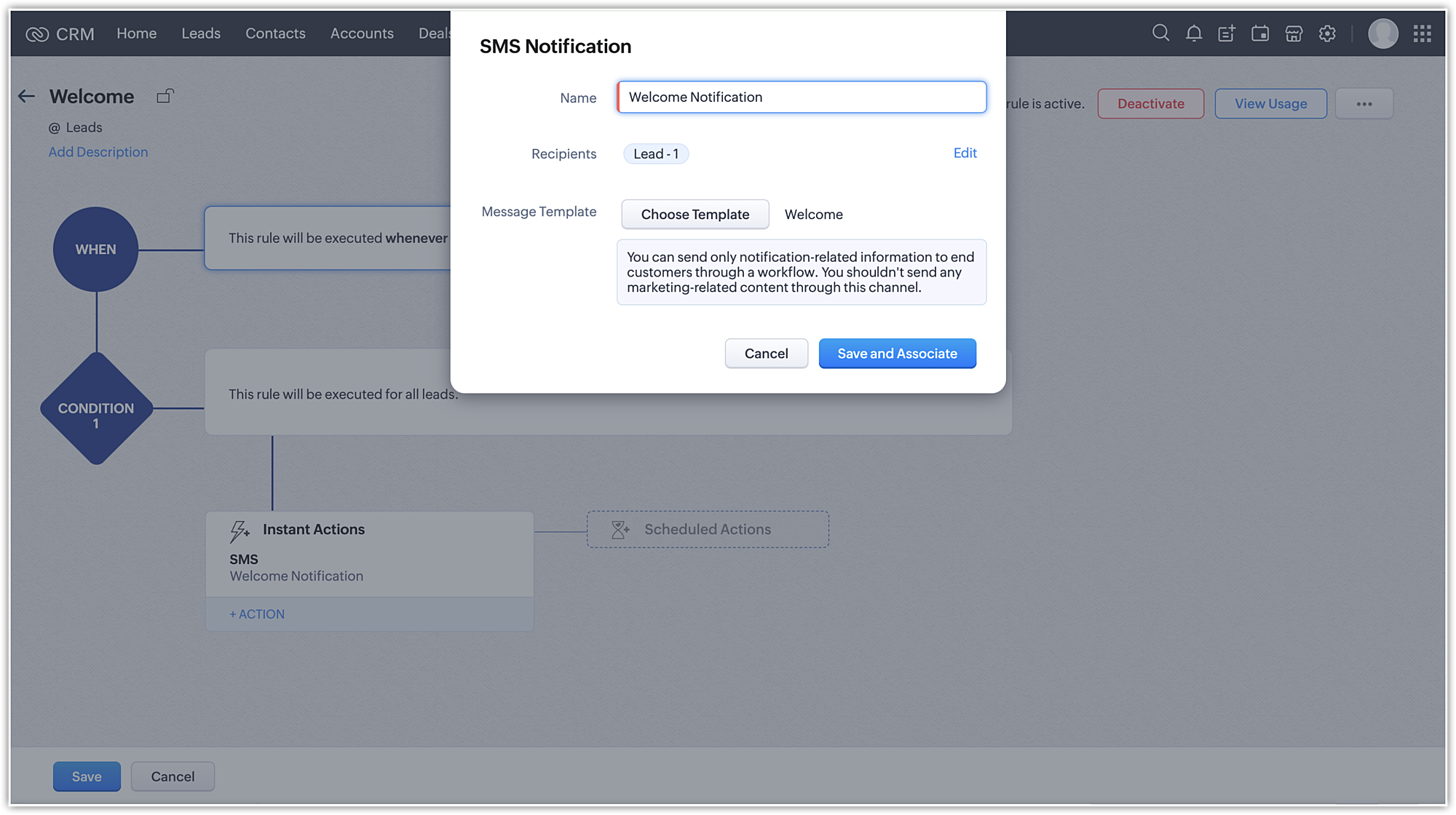 承認済みテンプレートをZoho CRMにアップロードし、アップロードしたテンプレートと、Zoho CRMに登録されているテンプレートを関連付けます。SMS通知の送信は、関連付けの設定に基づいて、実行されます。