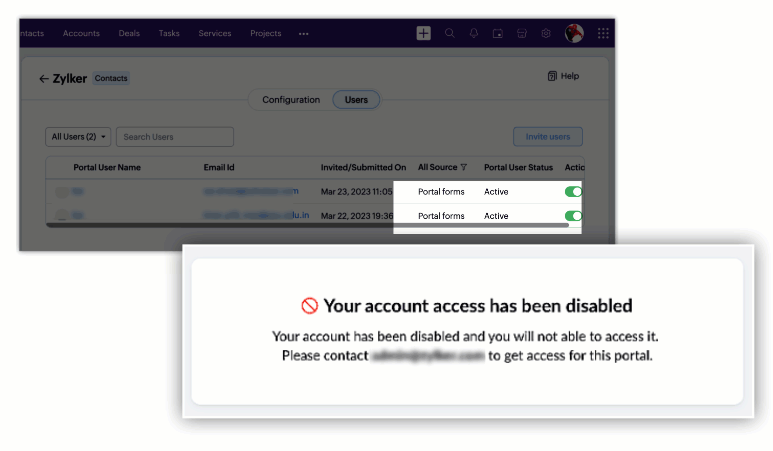 ポータルユーザー数が上限に達している場合:Zoho CRMのアカウントでポータルユーザー数が上限に達している場合、[メールアドレス「(該当のメールアドレス)」のユーザーに対して、このポータルが無効になっています]というエラーメッセージが表示されます。