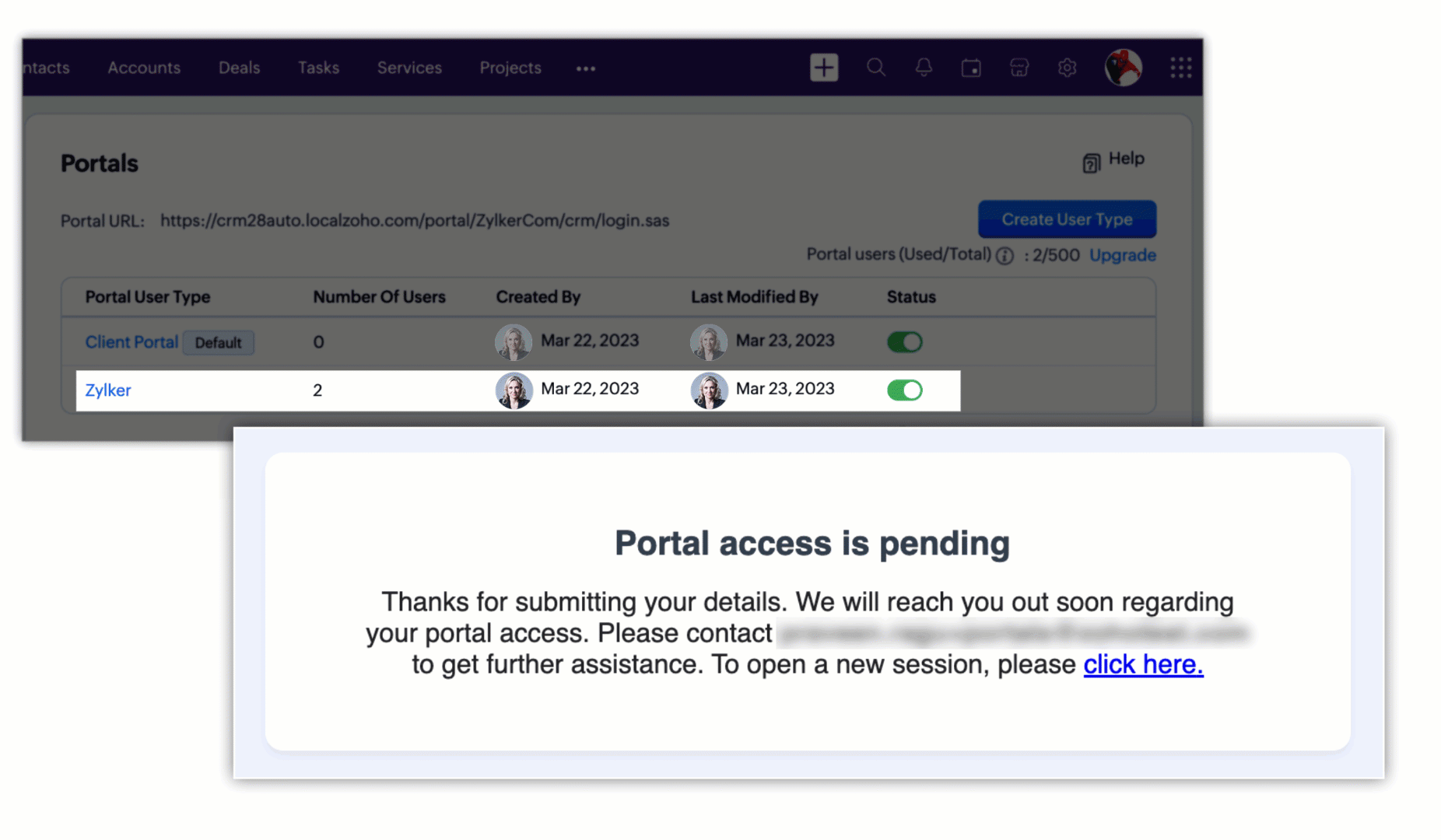 [ポータルへのアクセスが保留中のユーザー]の一覧にデータが追加されるたびに、Zoho CRMのユーザーに対して通知メールが送信されます。Zoho CRMのユーザーは、[ポータルへのアクセスが保留中のユーザー]の一覧内のデータに対して手動でアクセス権を付与できます。