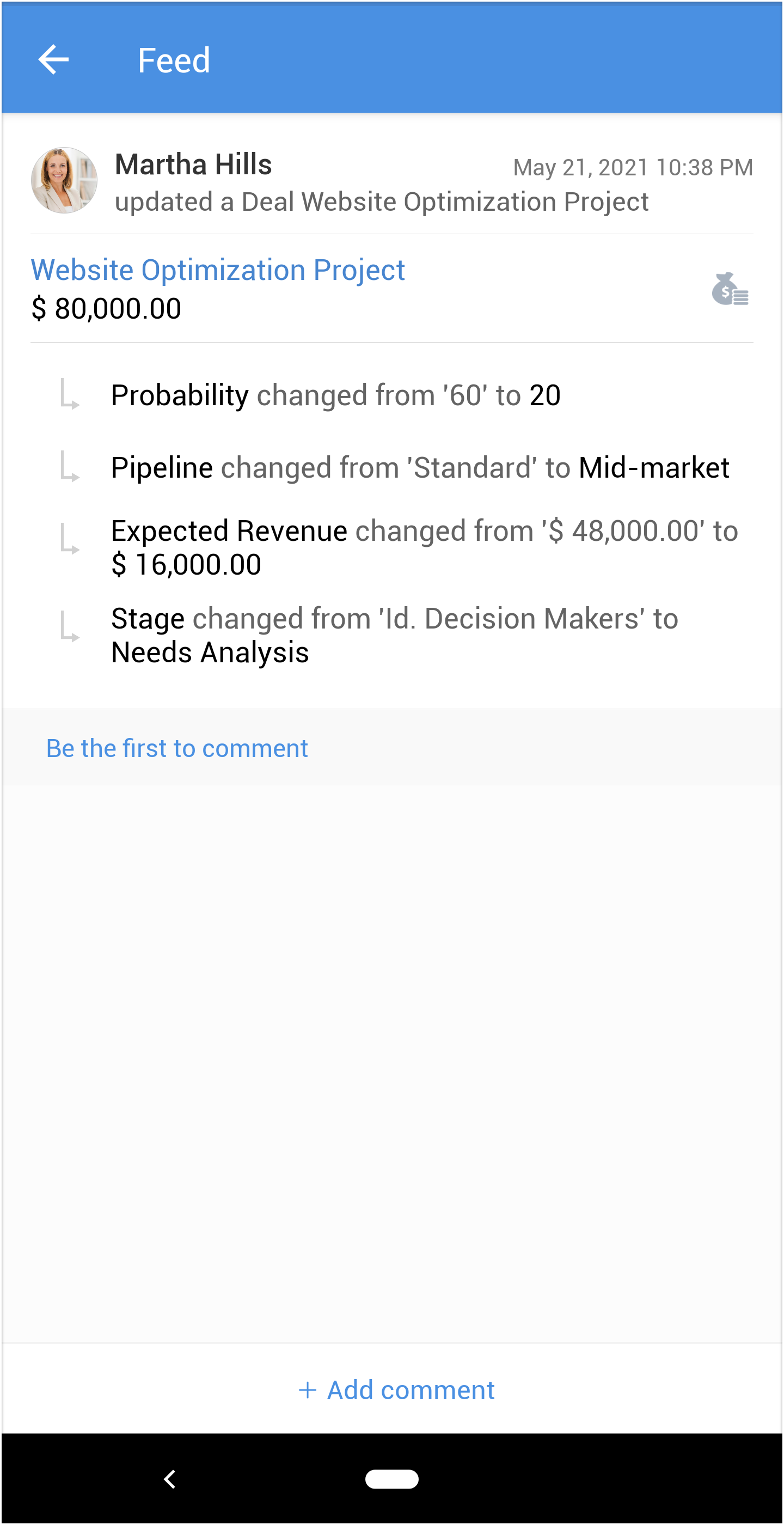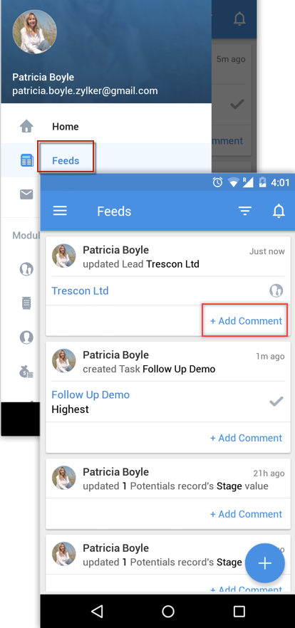 Zoho CRMのAndroid用アプリのフィード機能では、他のユーザーとの情報共有や意見交換、チームの活動の最新情報の確認が可能です(自分の活動だけではなく他のユーザーの活動も確認できます)。最新情報の投稿や表示、コメントの追加、ファイルの添付が可能です。また、条件を指定して目的のフィードを抽出することもできます。