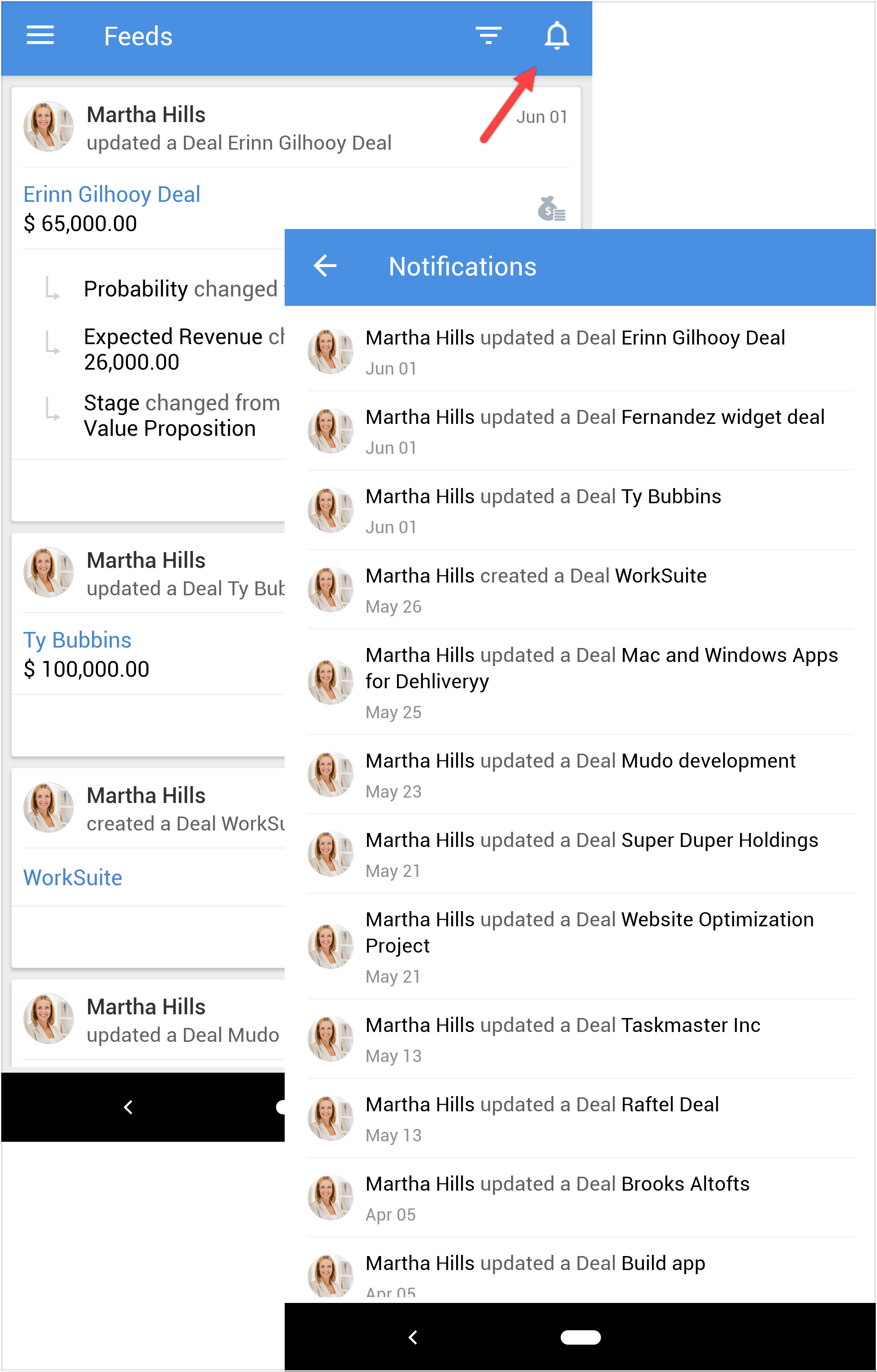 Zoho CRMアプリから[フィード]にアクセスします。 フィードの一覧が表示されます。