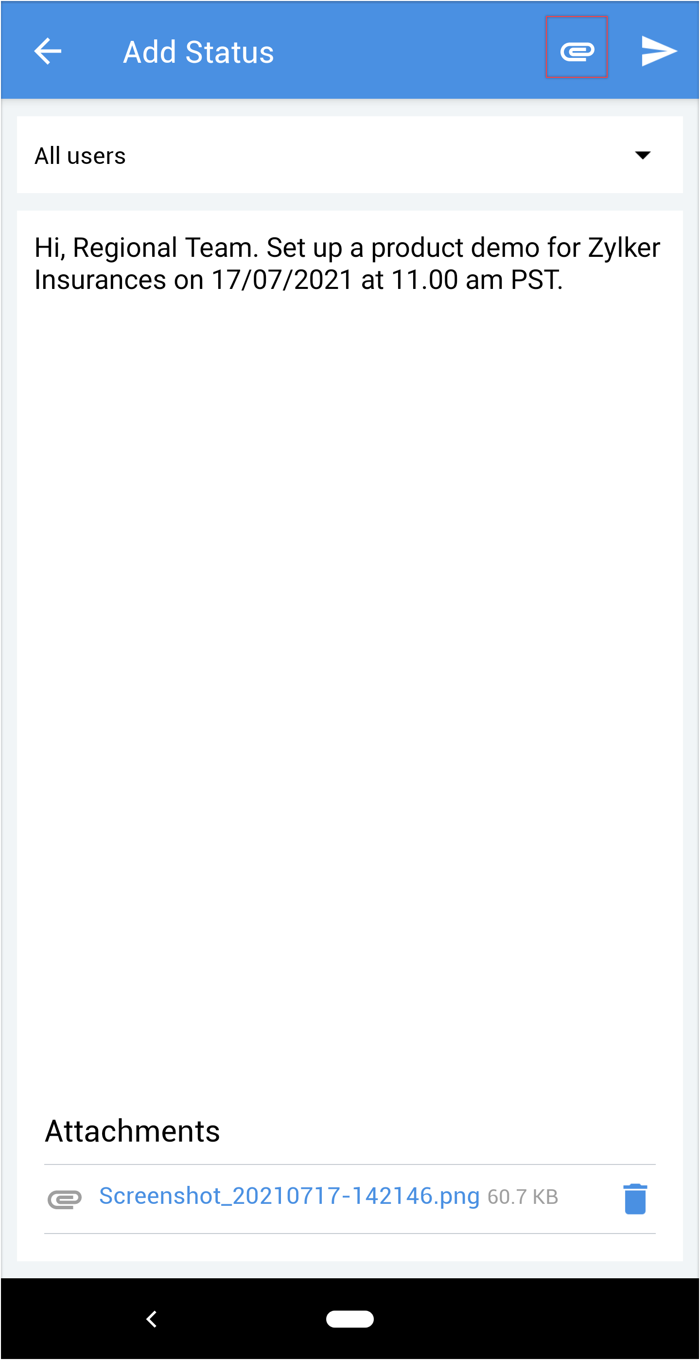 右上の添付アイコンをタップすると、ファイルをアップロードできます。