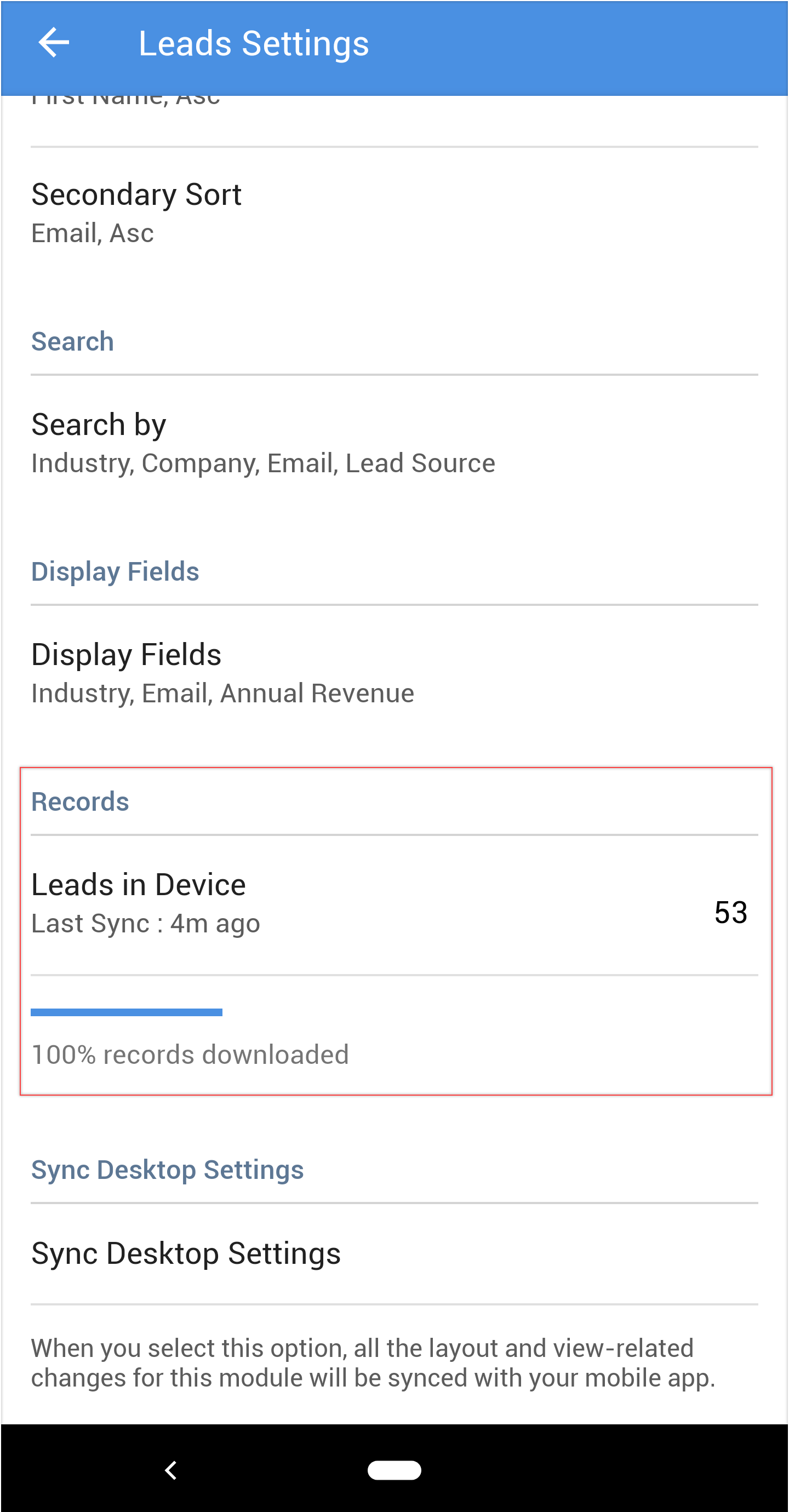 [データ]欄では、デバイスで該当のタブに登録されているデータ数や、最新の同期に関する情報が表示されます。[データをダウンロードしました]と表示されている場合、タブ内のすべてのデータはサーバーと同期されていることを表します。