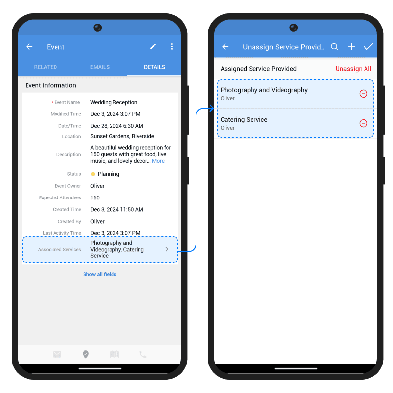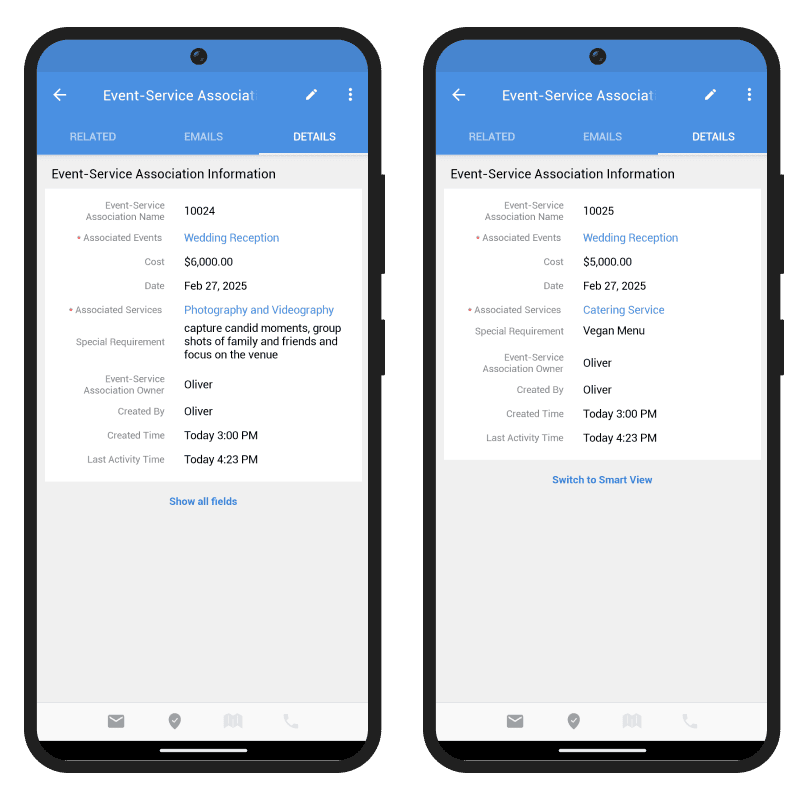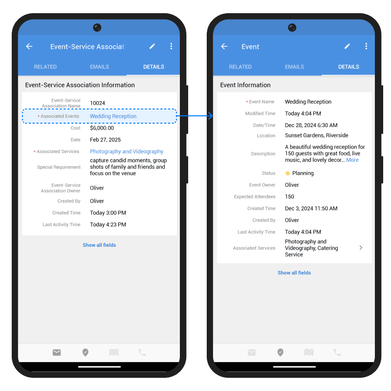 たとえば、複数選択ルックアップ項目を通じて[イベント]と[サービス]のタブが関連付けられている場合、[イベント]または[サービス]のいずれかのタブを開きます。 - ポップアップ画面で関連データの表示ボタンをタップします。関連付けられているデータが表示されます。