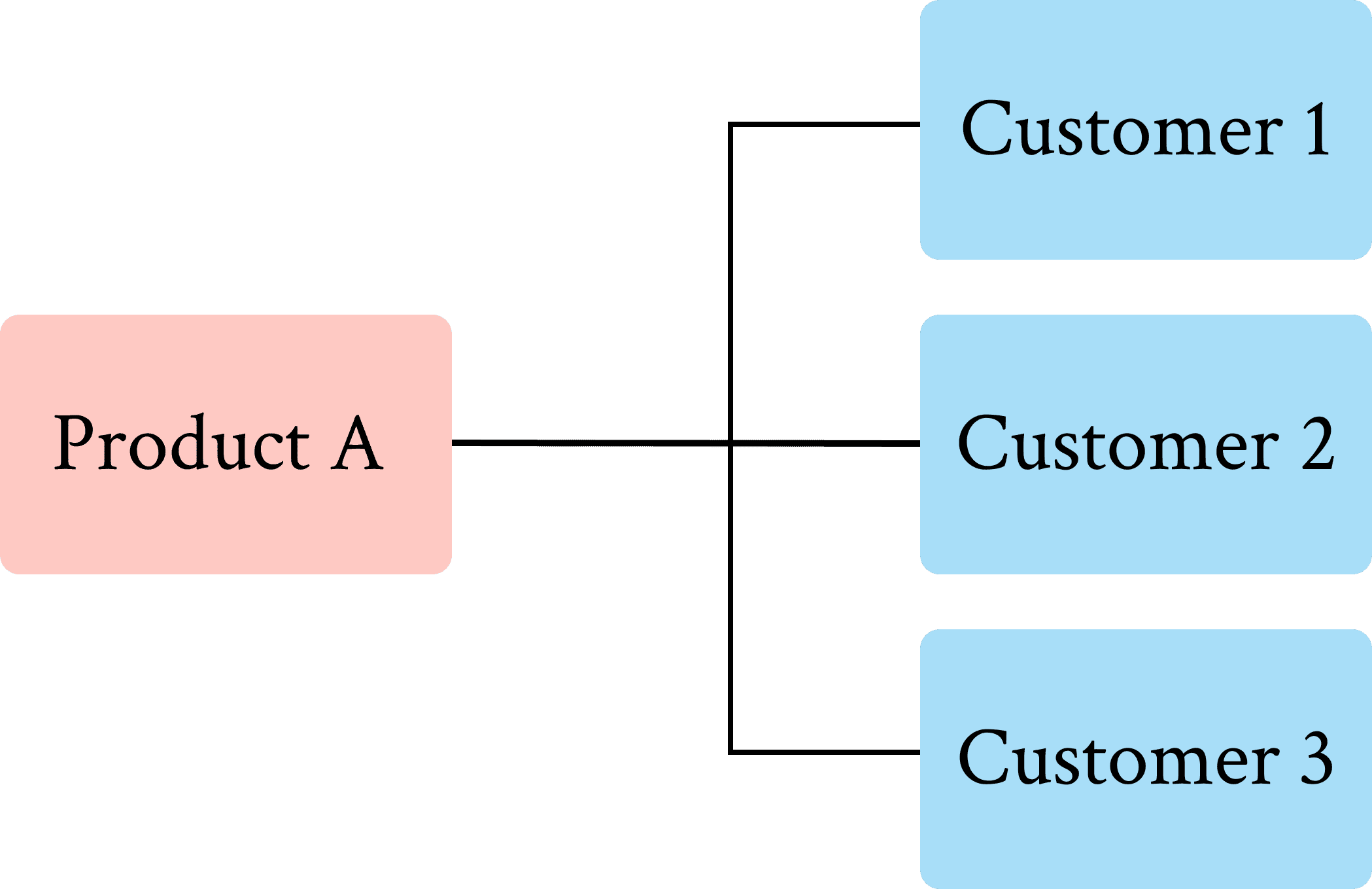 - 1対多の参照関係(単一選択ルックアップ項目):1件のデータに対して、複数のデータを関連付けることができます。たとえば、1件の商品に対して、複数の顧客を関連付けることが可能です。