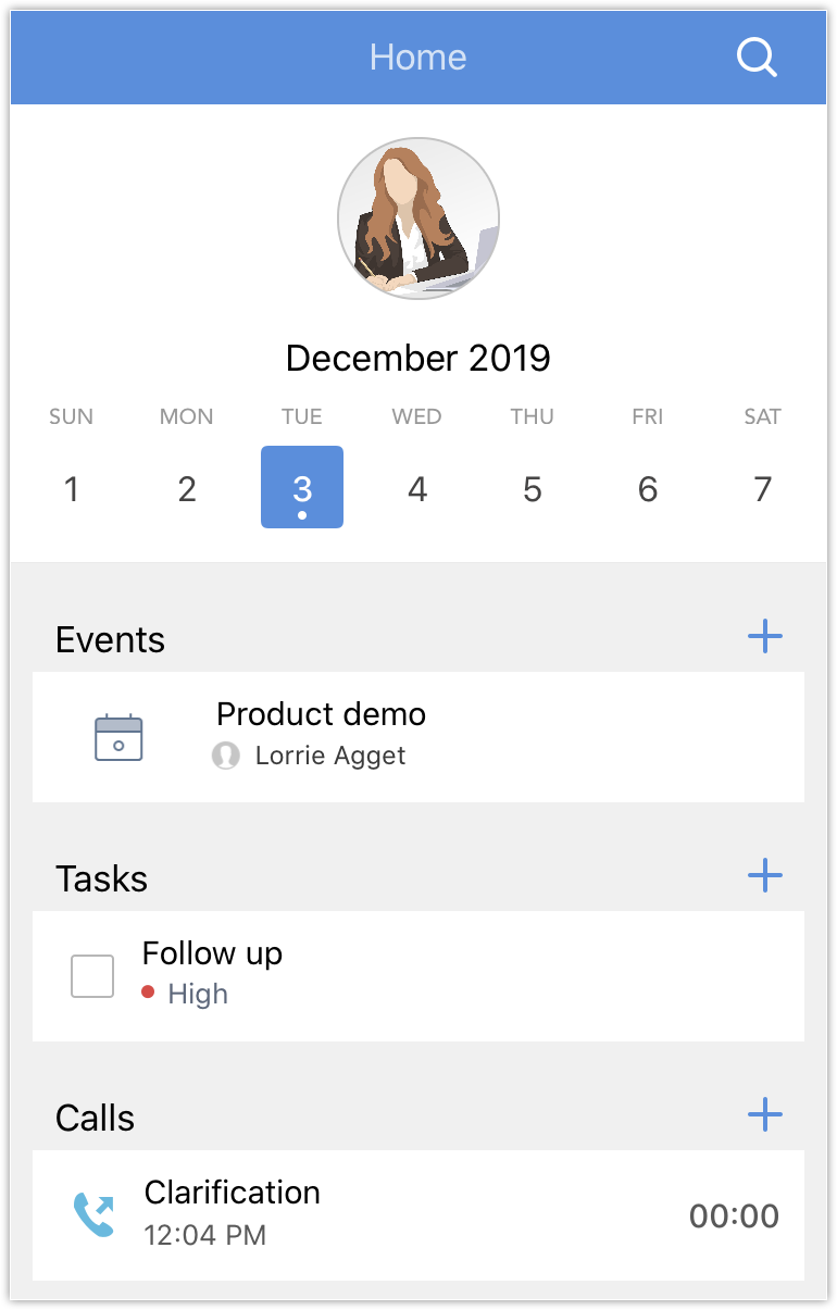 ホーム画面には、その日やカレンダー全体に登録されている予定、タスク、通話のすべてのデータが一覧表示されます。ホーム画面から、新しいデータを作成したり、既存のデータを完了に設定することもできます。
