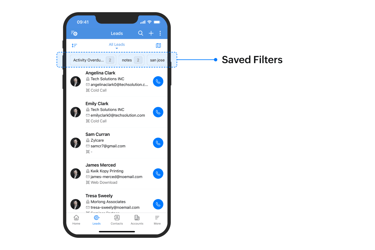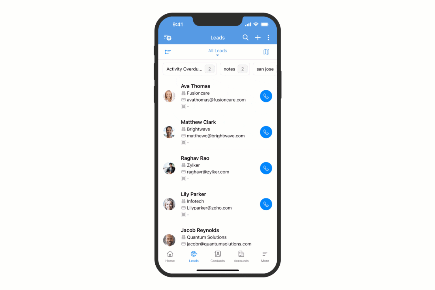 Zoho CRMのモバイルアプリでは、Webアプリで作成して保存しておいた詳細フィルターを使用できます。モバイルアプリを使用するにあたって、データをすばやく抽出して表示することが可能です。