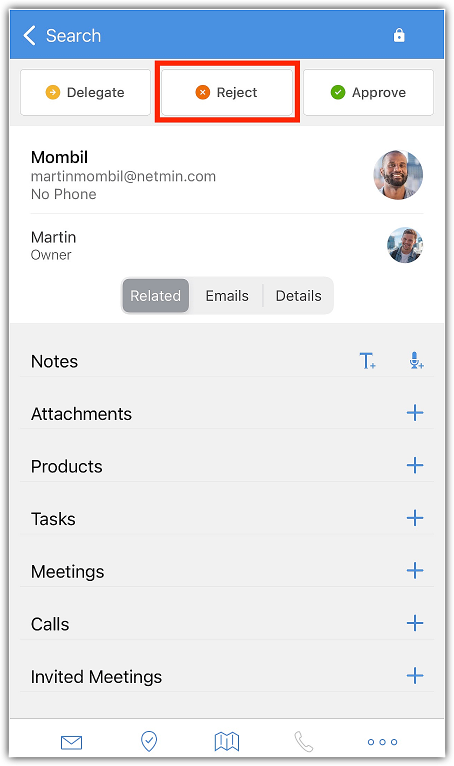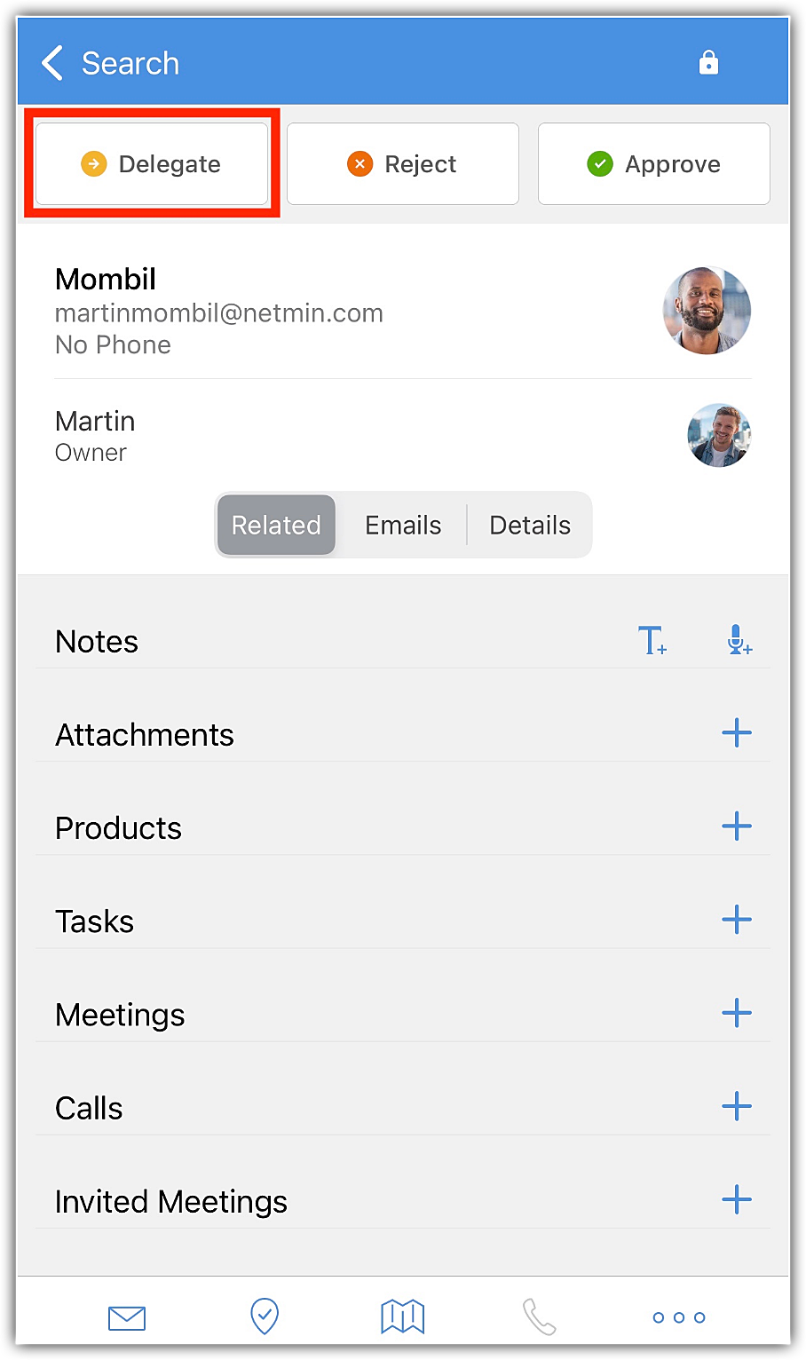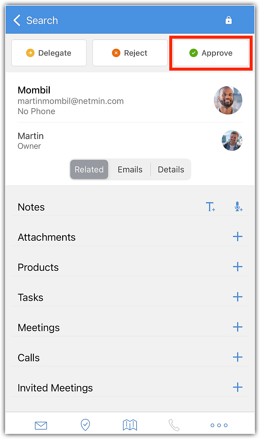 承認待ちのデータの処理(承認、委任、却下)は、モバイルアプリの[処理待ち]タブ、またはデータの詳細ページの[詳細]タブから可能です。