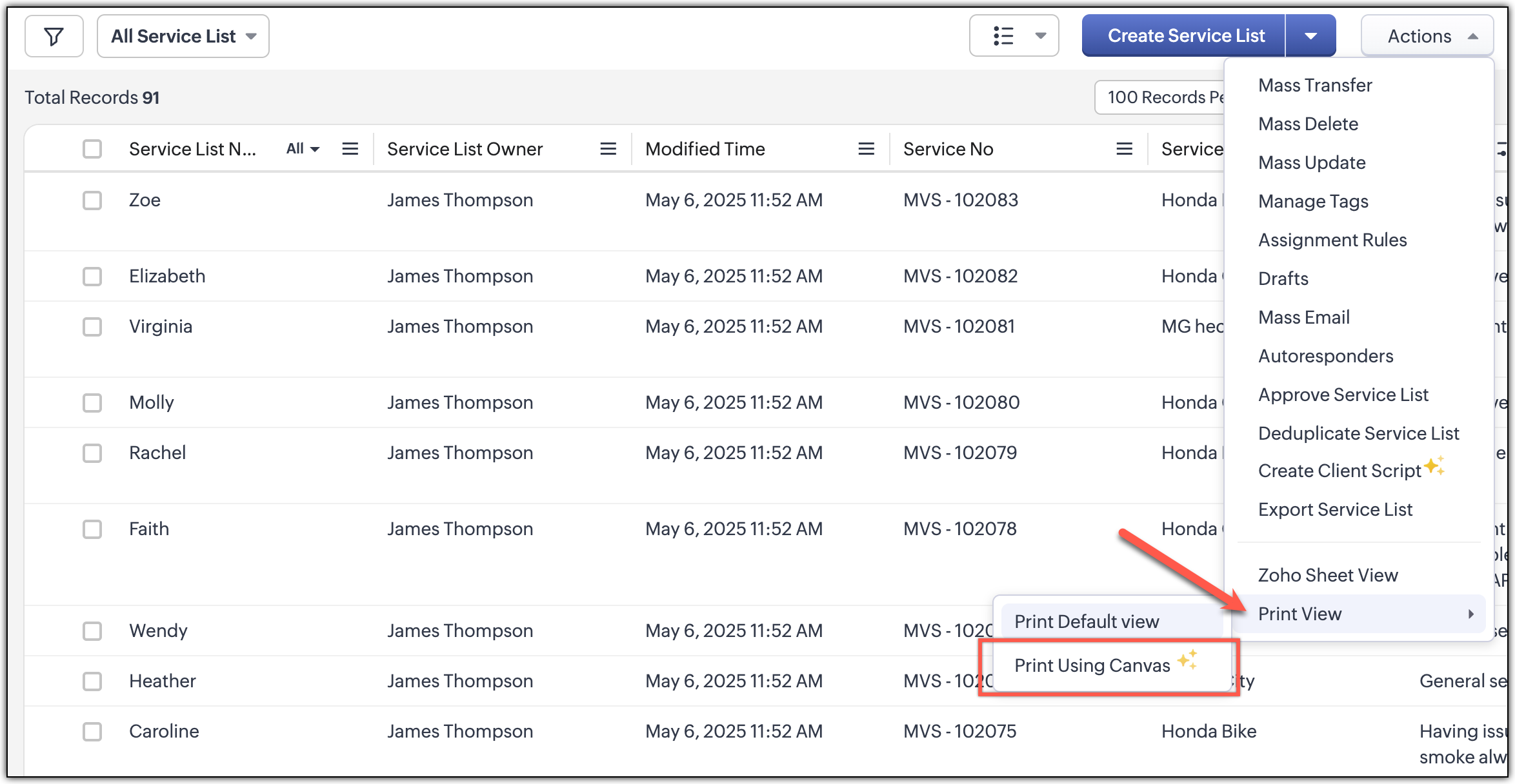 自動車修理サービスを提供している組織で、Zoho CRMを利用して顧客の車両、サービスの依頼、苦情、修理などの情報を管理しているとします。技術担当者は、修理の完了後にZoho CRMでサービスに関する情報を入力/更新します(例:車両モデル、サービスの種類、交換したパーツ、工賃、請求金額など)。