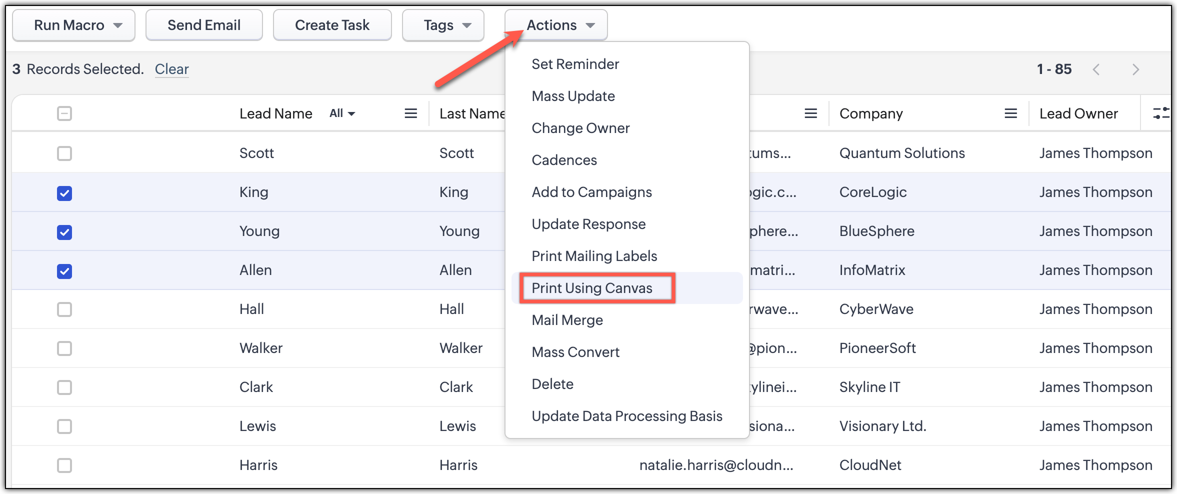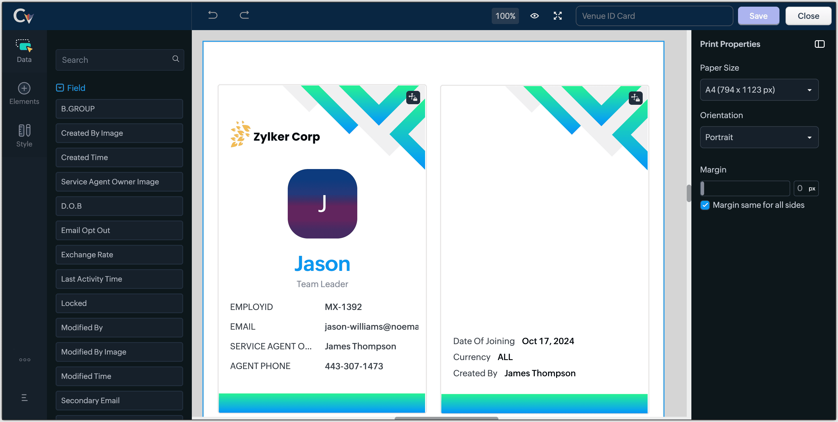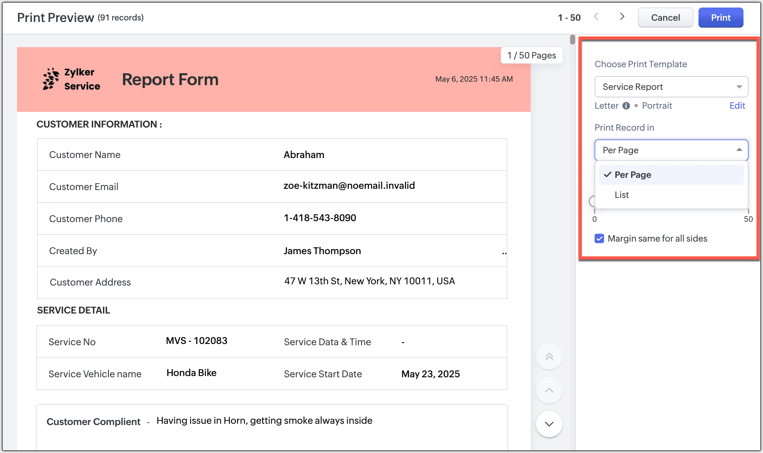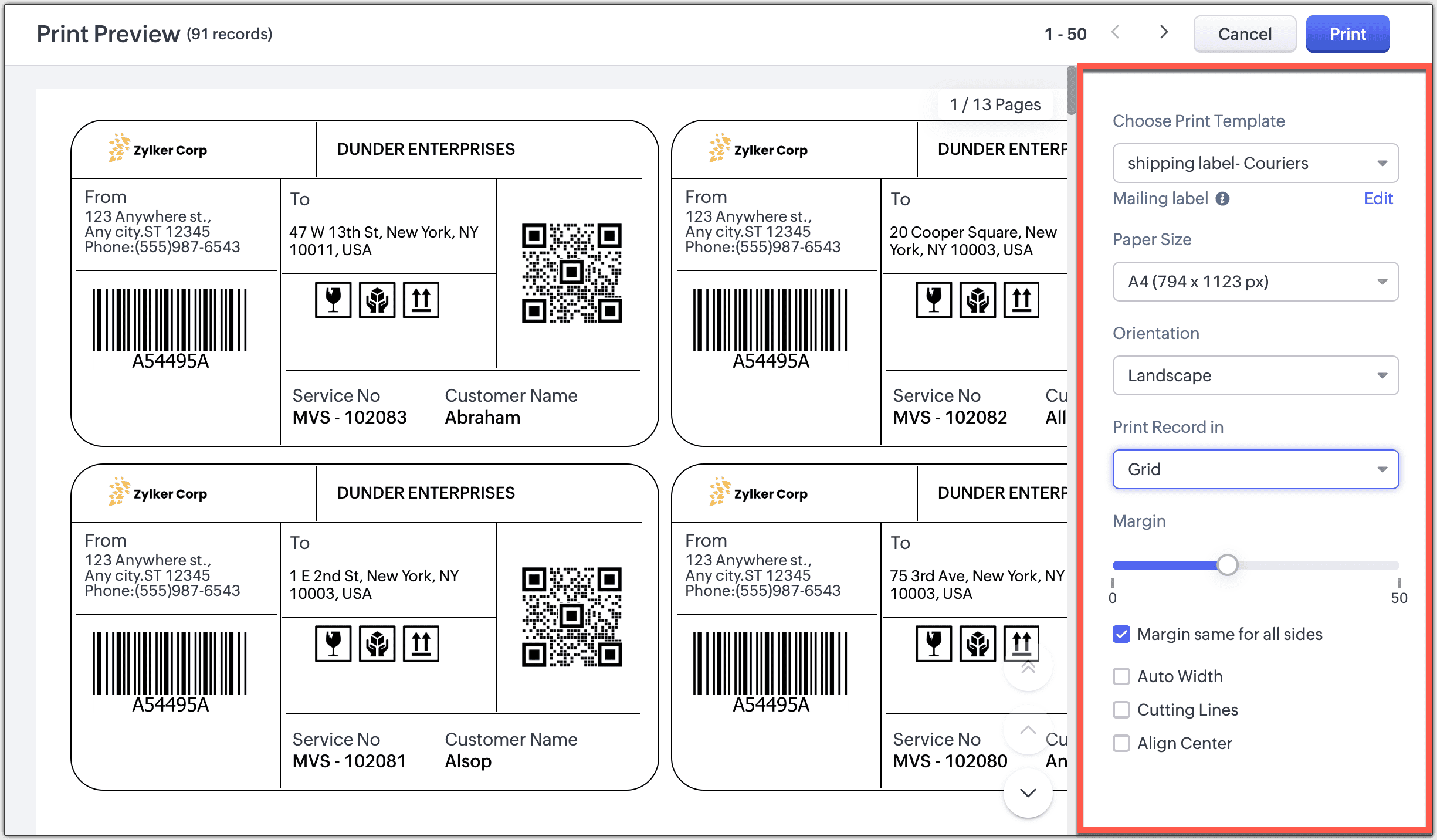 キャンバスの印刷用レイアウトを利用することで、要件に合わせてカスタマイズしたキャンバスのレイアウトからデータを用紙に印刷できます。配送ラベルや各種フォームなどのレイアウトをカスタマイズし、Zoho CRMの操作画面から直接印刷することが可能です。印刷のためにデータをエクスポートしたり、アプリやサービスを切り替えたりする手間を省くことができます。