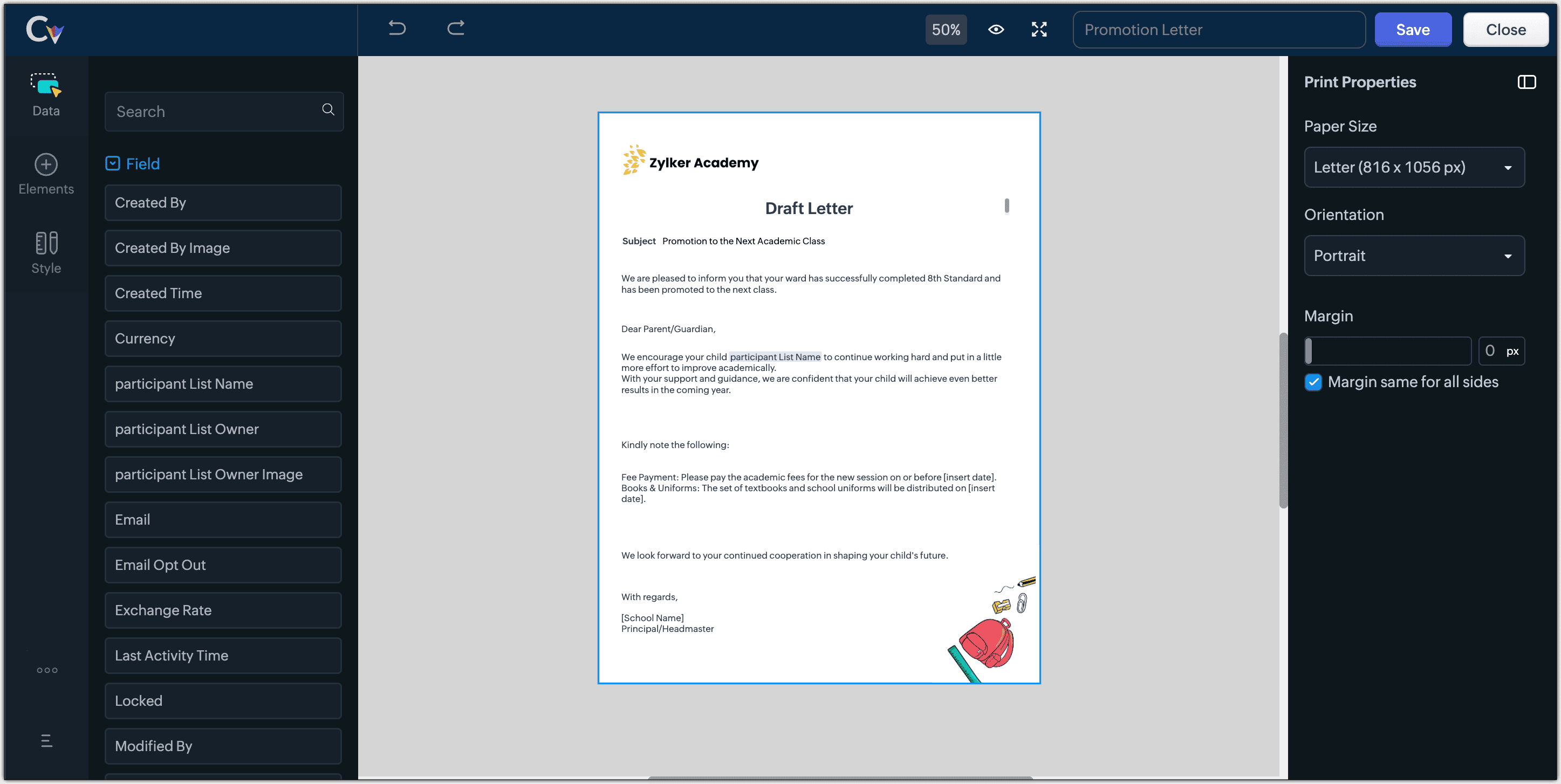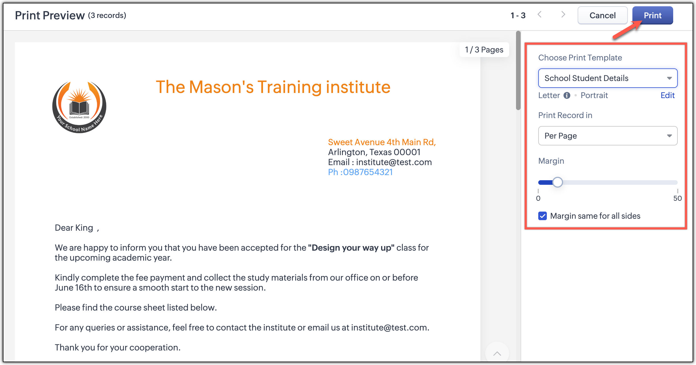 学校の各種データをZoho CRMで管理していて、学校の新学期に向けて授業の内容を説明したコース表を作成して学校で配布するとします。この場合、以下のようにキャンバスの印刷用レイアウトを利用できます。