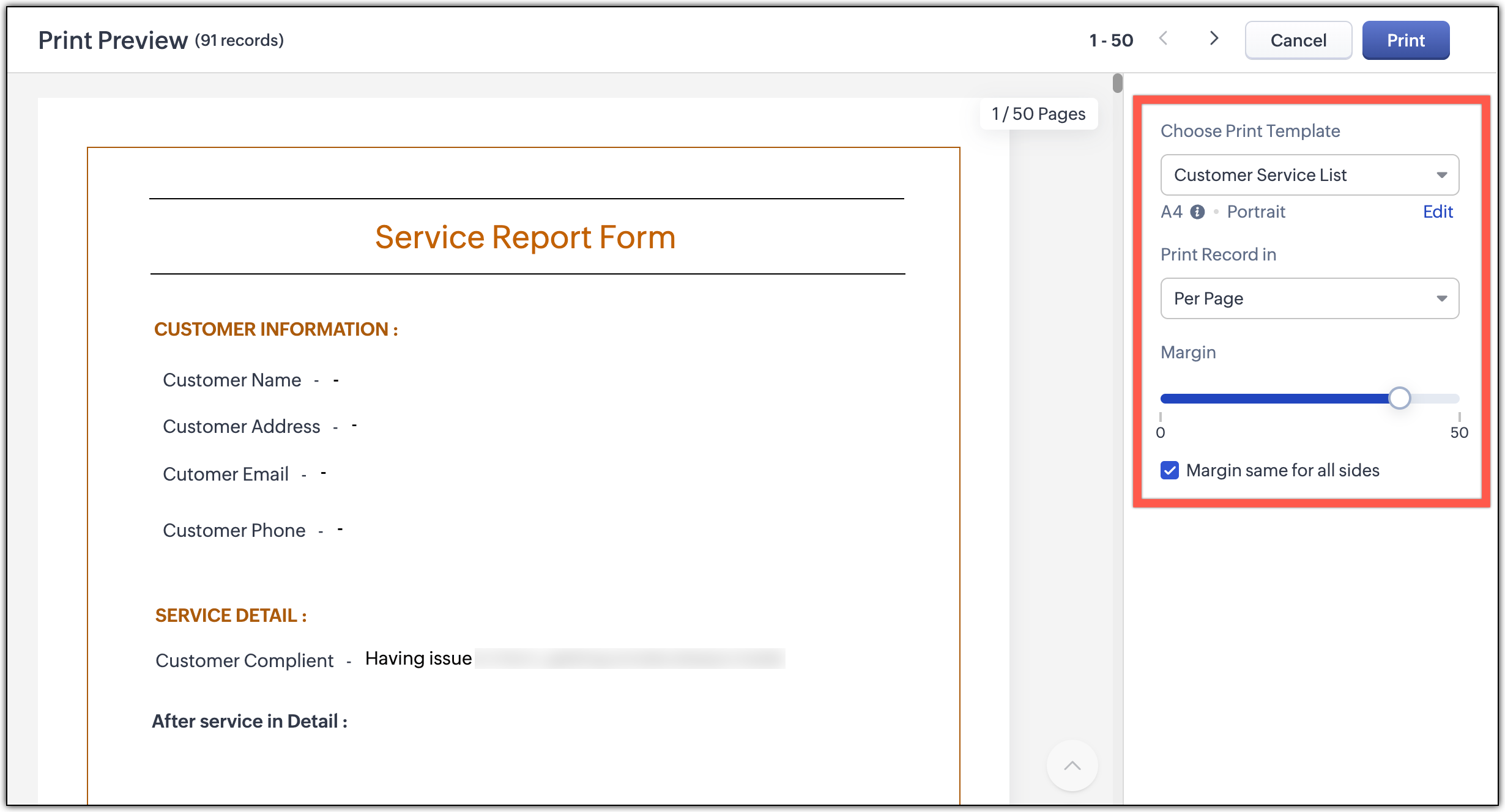 この場合、キャンバスの印刷用レイアウトを利用することで、要件に合わせてサービス報告書を作成できます。作成するにあたって、以下の情報を記載することが可能です。