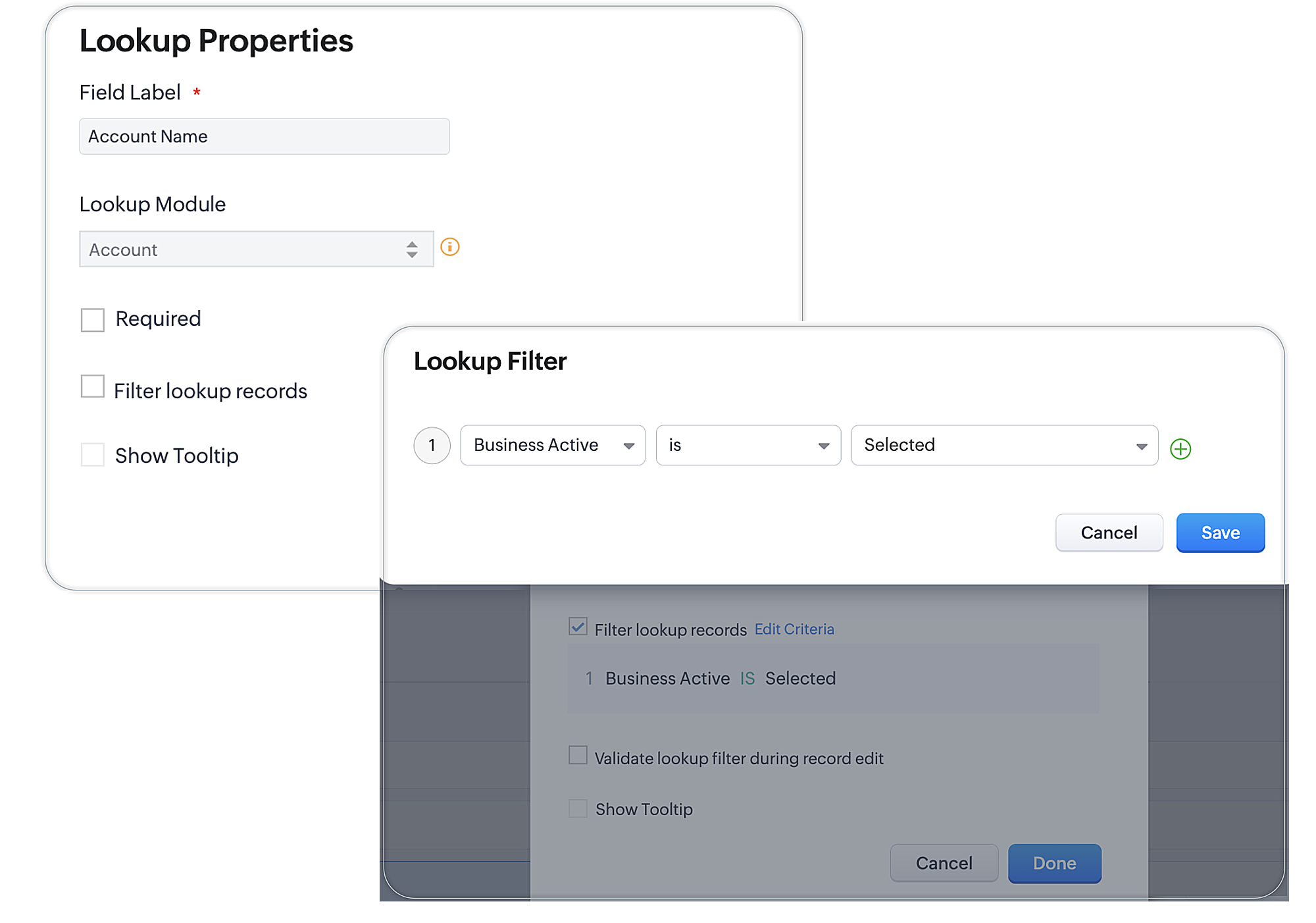 Zoho CRMには、ルックアップ項目用のフィルター機能が用意されています。この機能を利用すると、ルックアップ項目の値の選択肢に、一定の条件を満たす値のみが表示されます。ルックアップ項目の値を選択するにあたって、対象となるデータのみをわかりやすく表示することが可能です。