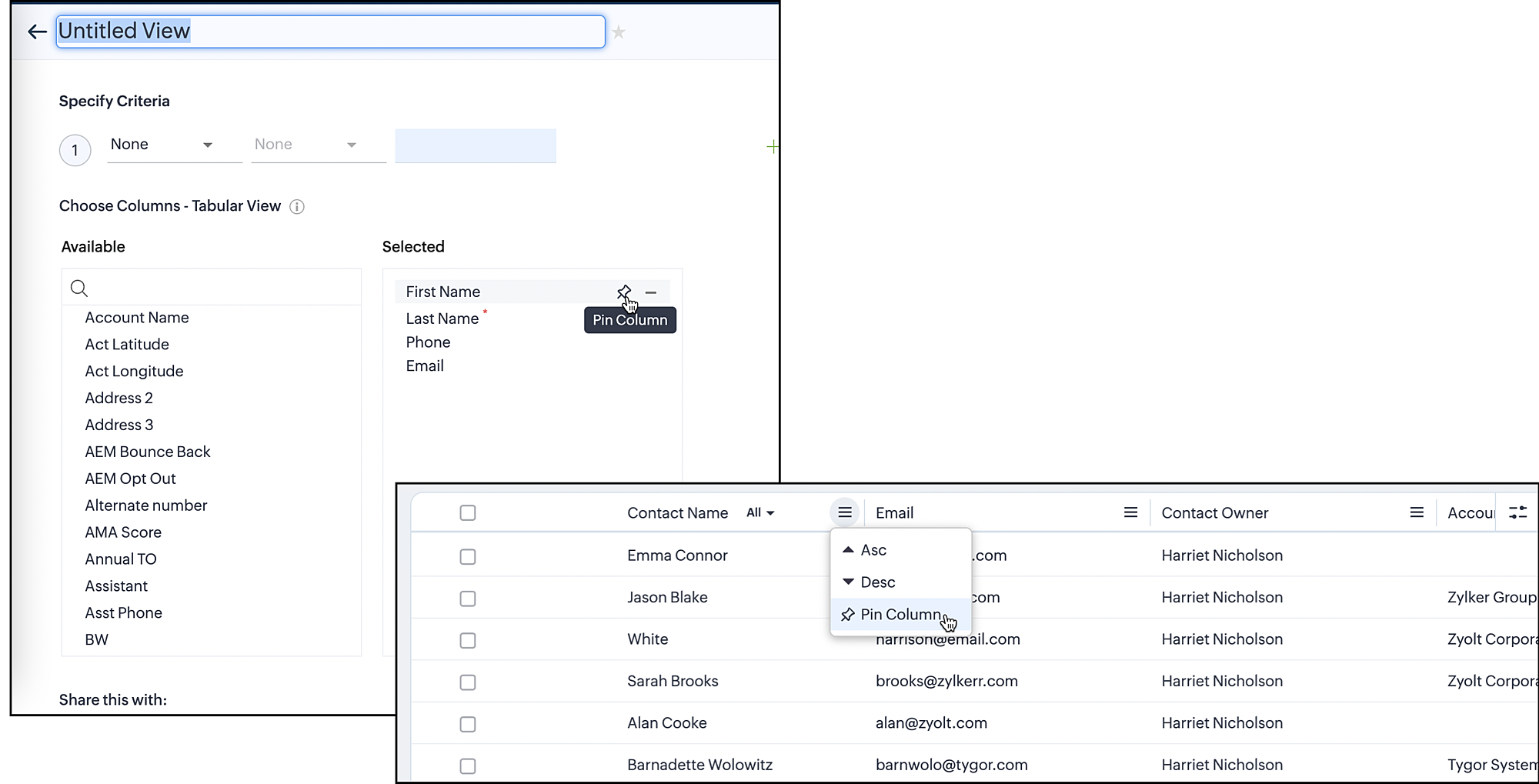 Zoho CRMには、組織内のすべてのユーザーがすぐに使用できる、 標準 ビューが用意されています。また、独自のビュー(カスタムビュー)を作成することも可能です。作成したビューは、他のユーザーに共有することもできます。