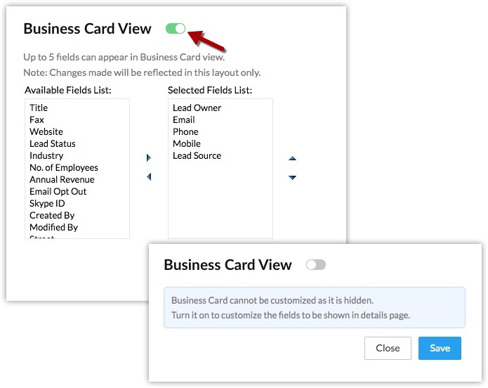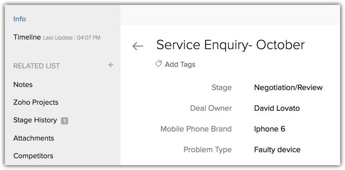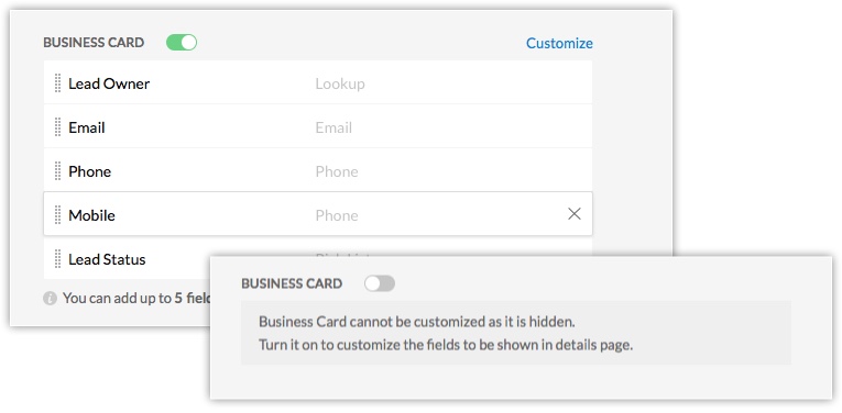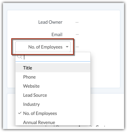 データの詳細ページの上部にある[概要表示]では、よく参照する項目を選択して見やすい場所に表示できます(例:担当者、メールアドレス、電話番号)。概要表示に表示する項目は、追加することも可能です。その他、表示する項目の変更、概要表示自体の無効化など、必要に応じて概要表示のカスタマイズも可能です。