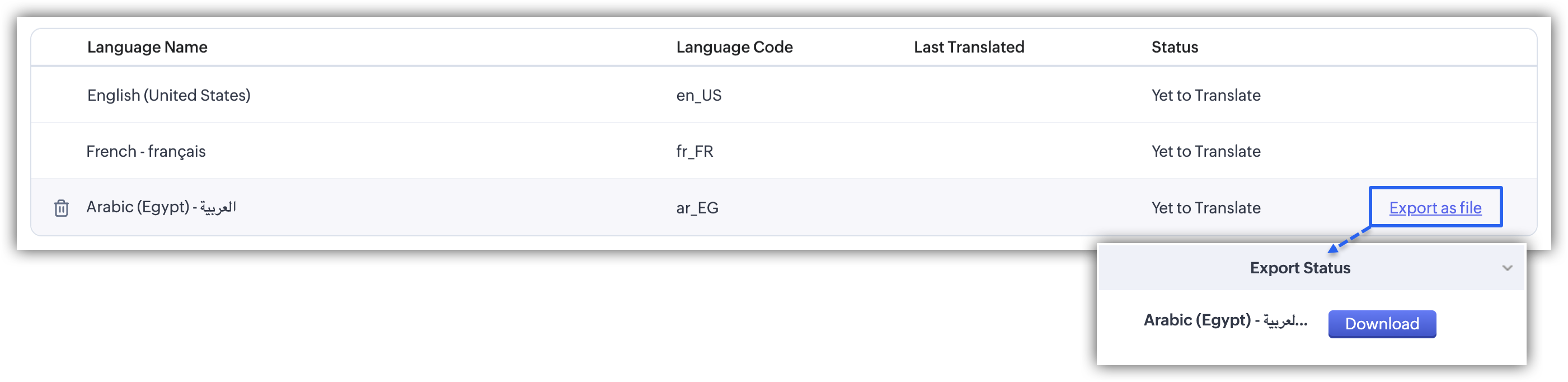 - 追加した言語の[エクスポート]リンクをクリックして、該当の言語のファイルをエクスポート(ダウンロード用に出力)します。