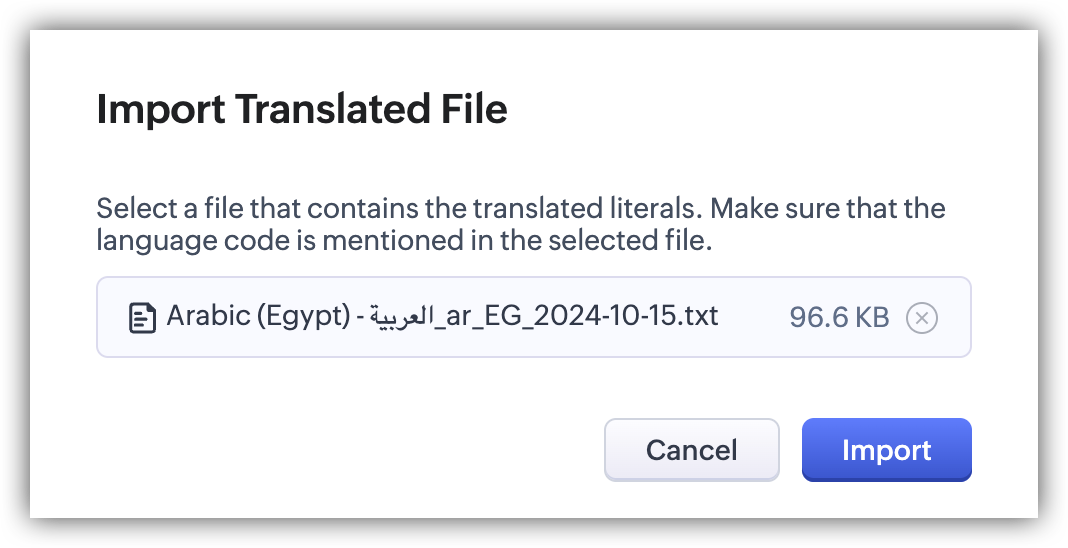 - 言語ファイルのインポート画面で、翻訳済みの言語ファイルを選択します