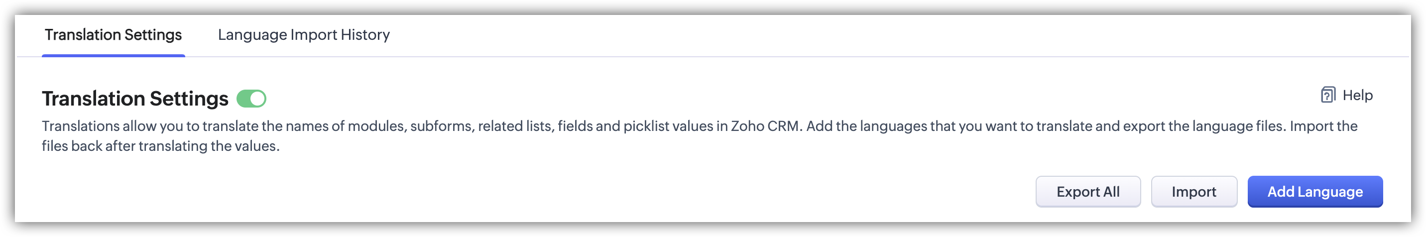 - Zoho CRMアカウントにおいて翻訳機能が不要になった場合、すべての翻訳設定を無効にすることができます。