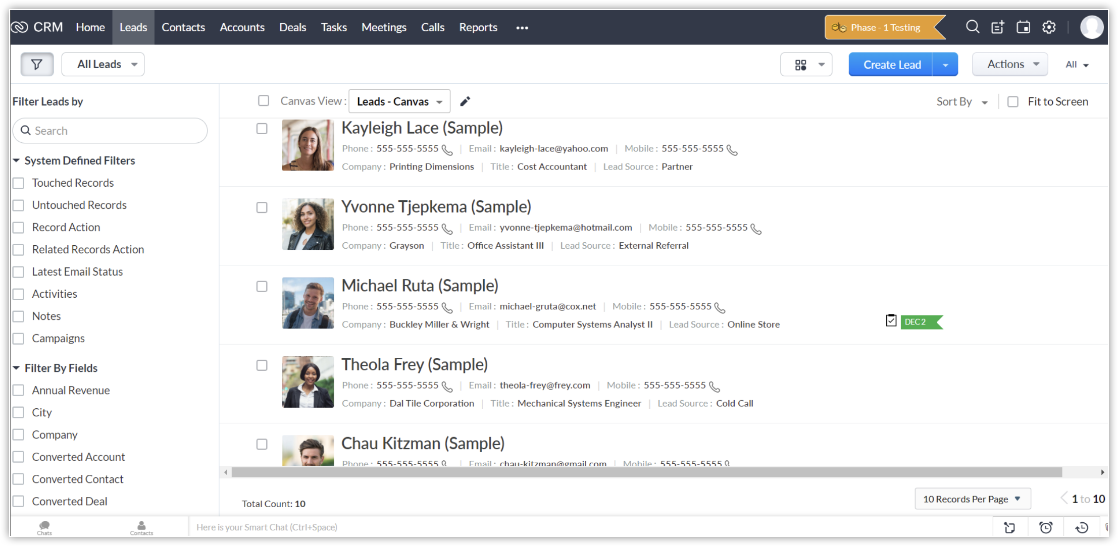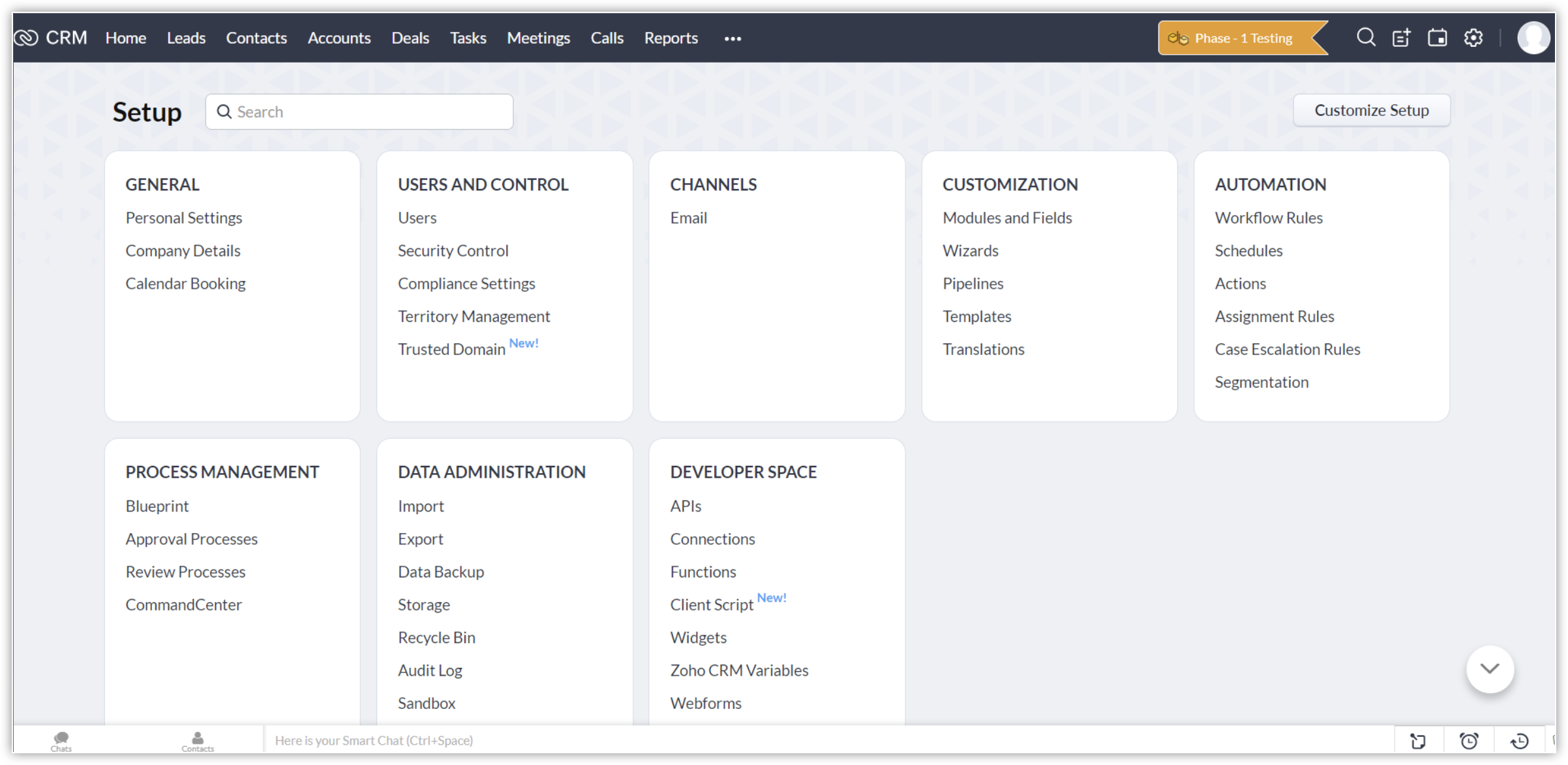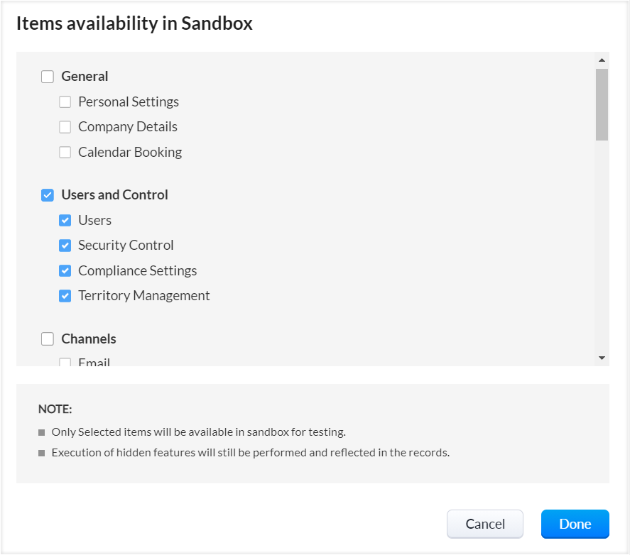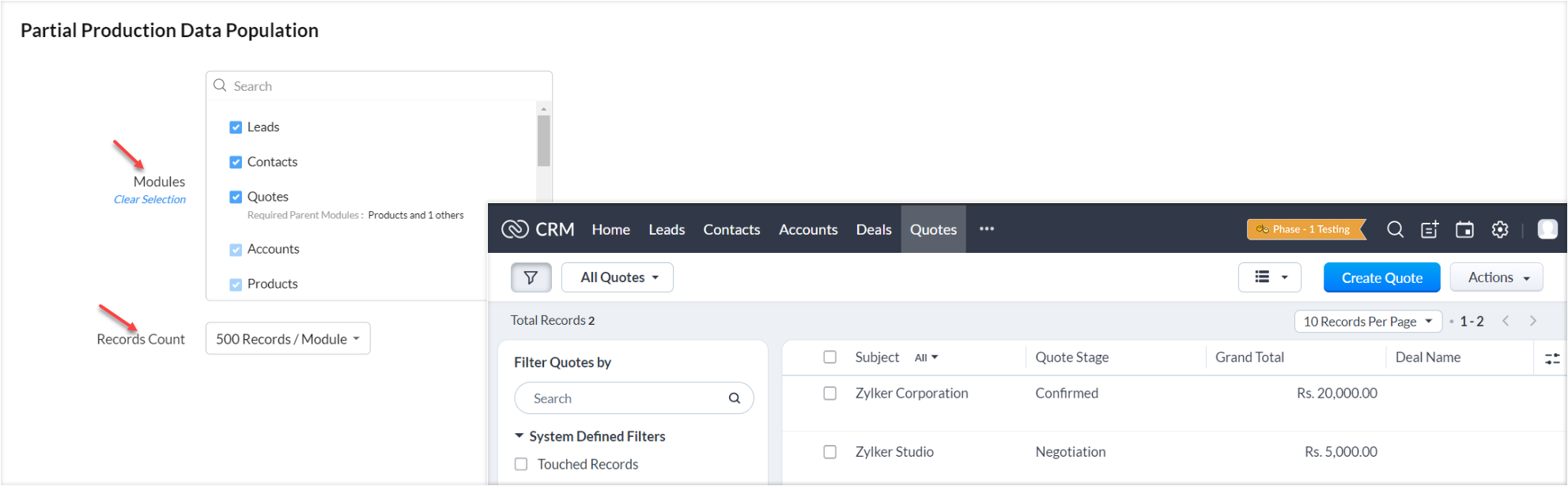 必要に応じて、Zoho CRMのすべての設定、または一部の設定をテストできます。 |