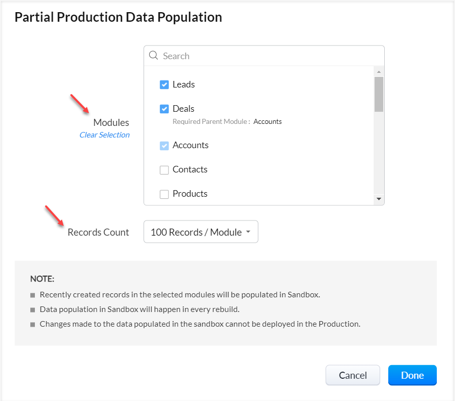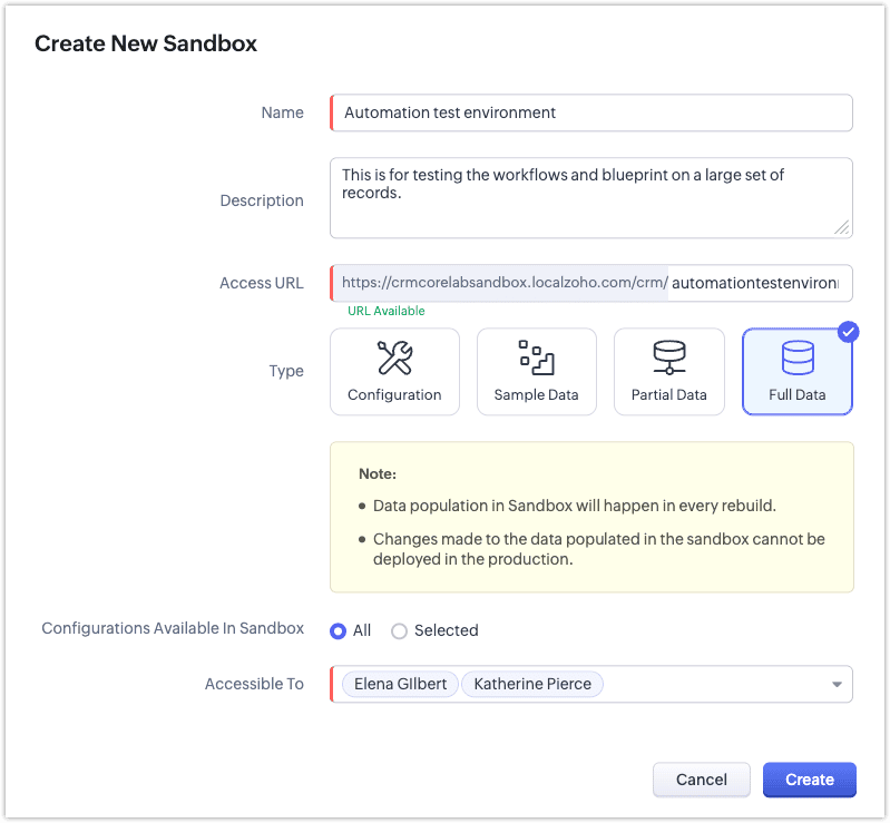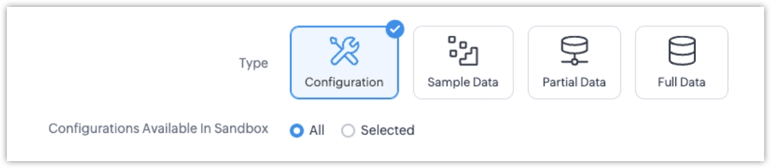一部のタブまたはデータを本番環境からコピーしてテストに使用できます。必要なデータのみを選択することで、機密データの安全性を守り、ストレージの使用量を抑えることができます。