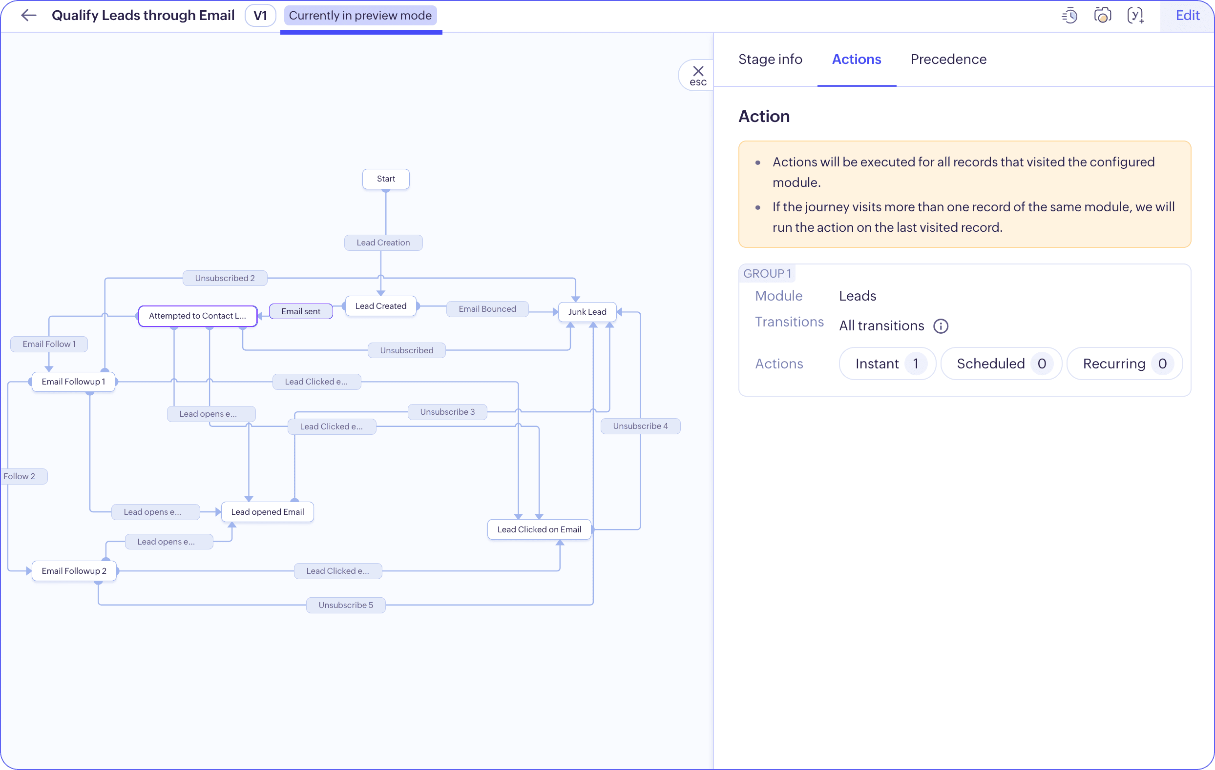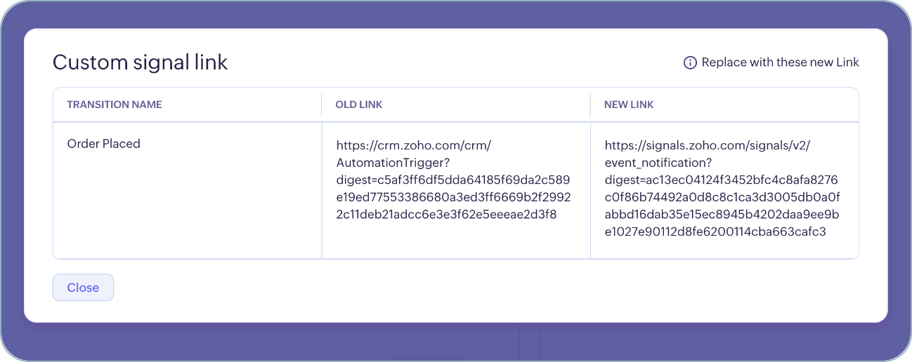 - Zohoサービス側では、組織で使用されているAPIの内容を表示するための権限がありません。そのため、Zohoサービス側で外部連携のデータ元のAPIに関する情報を変更することはできません。ジャーニーに関する情報を引き続き取得するには、バージョン1.0が廃止される前にこれらの情報を変更することをお勧めします。
