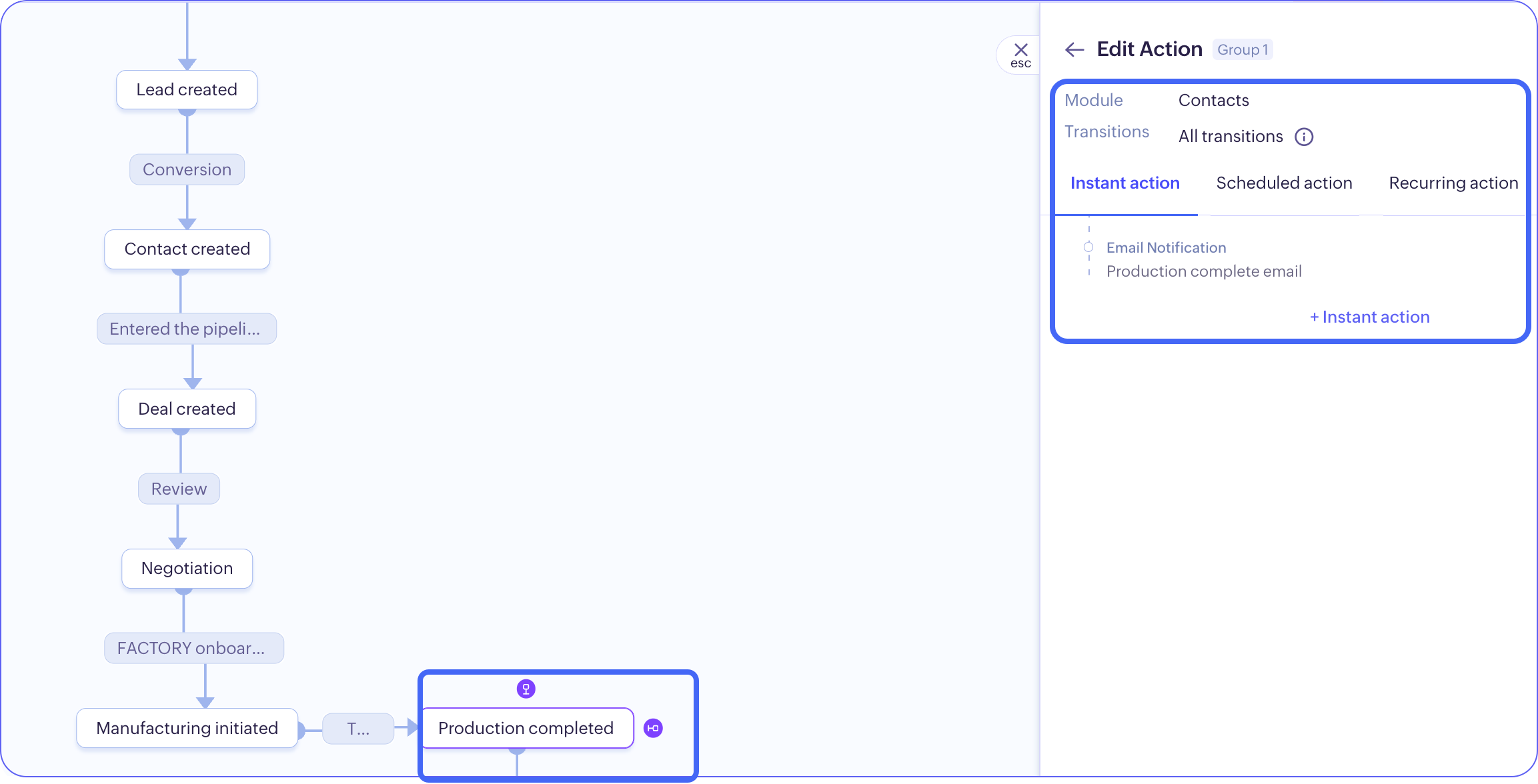 たとえば、対象製品の作成が完了した際に顧客にメールを送信したいとします。対象製品の作成の完了のステージは、工場での作成待ちの後のステージです。バージョン1.0では、別のステージ(例:顧客の更新)を作成し、さらに別のステージ(例:連絡先の作成)に接続する必要がありました。 - バージョン2.0では、このステージ間の処理の設定をよりスムーズに行うことが可能です。