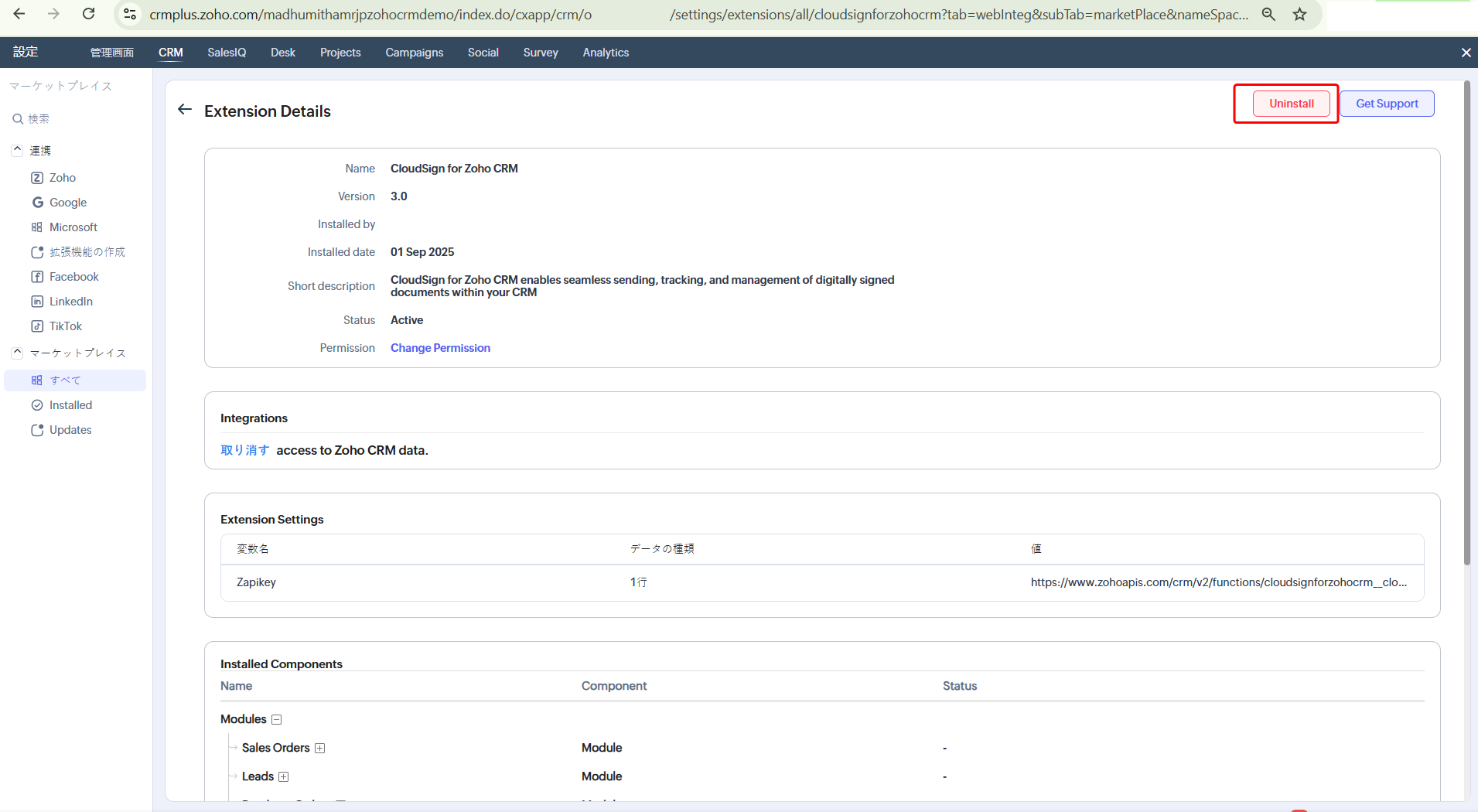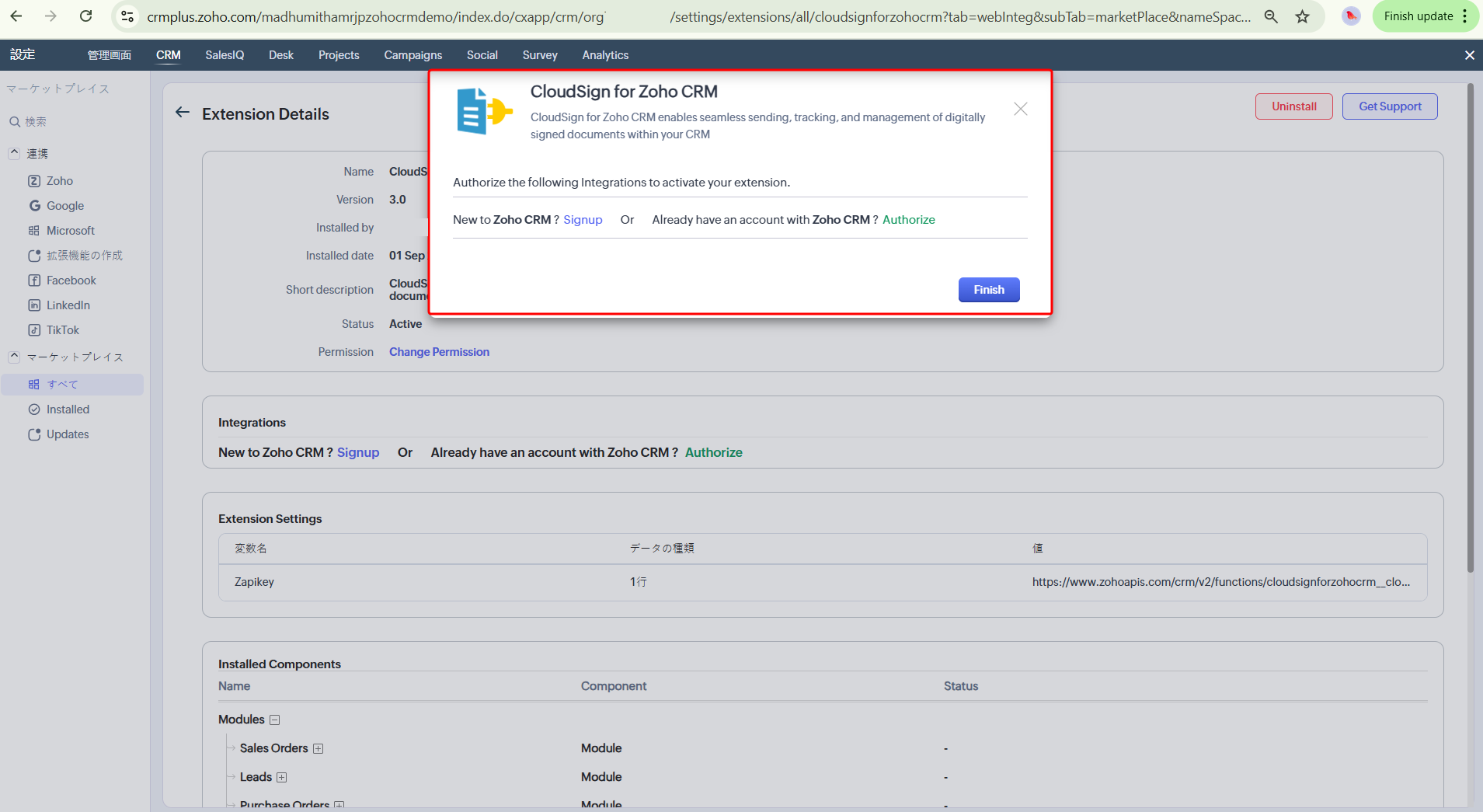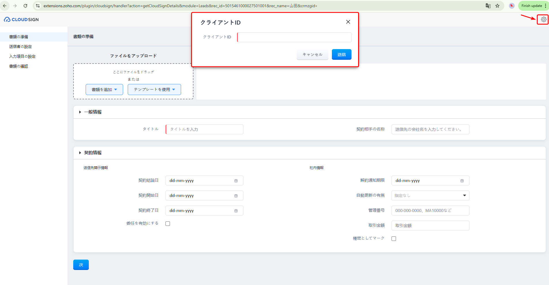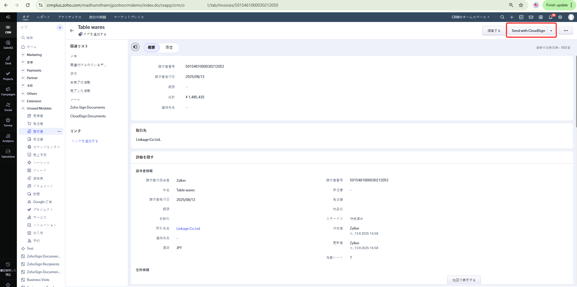 Zoho CRMの各種書類タブでCloudSignの書類を関連リストとして表示するには、最初にZoho CRMアカウントの認証を行う必要があります。一度認証を行うと、その後はZoho CRMのデータの詳細ページに、関連するCloudSignの書類が同期されて表示されるようになります。