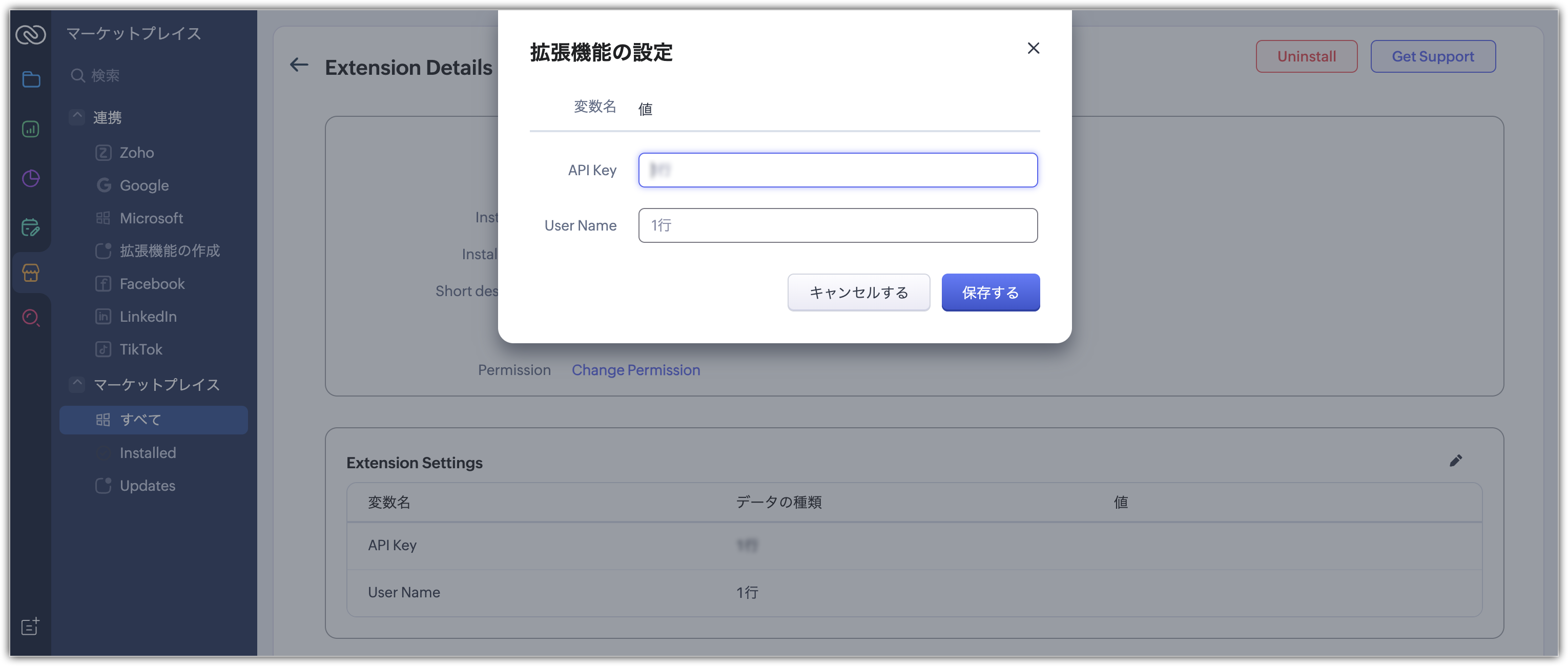 [インストール済み] タブでは、Zoho CRMにインストールされているすべての拡張機能を確認できます。