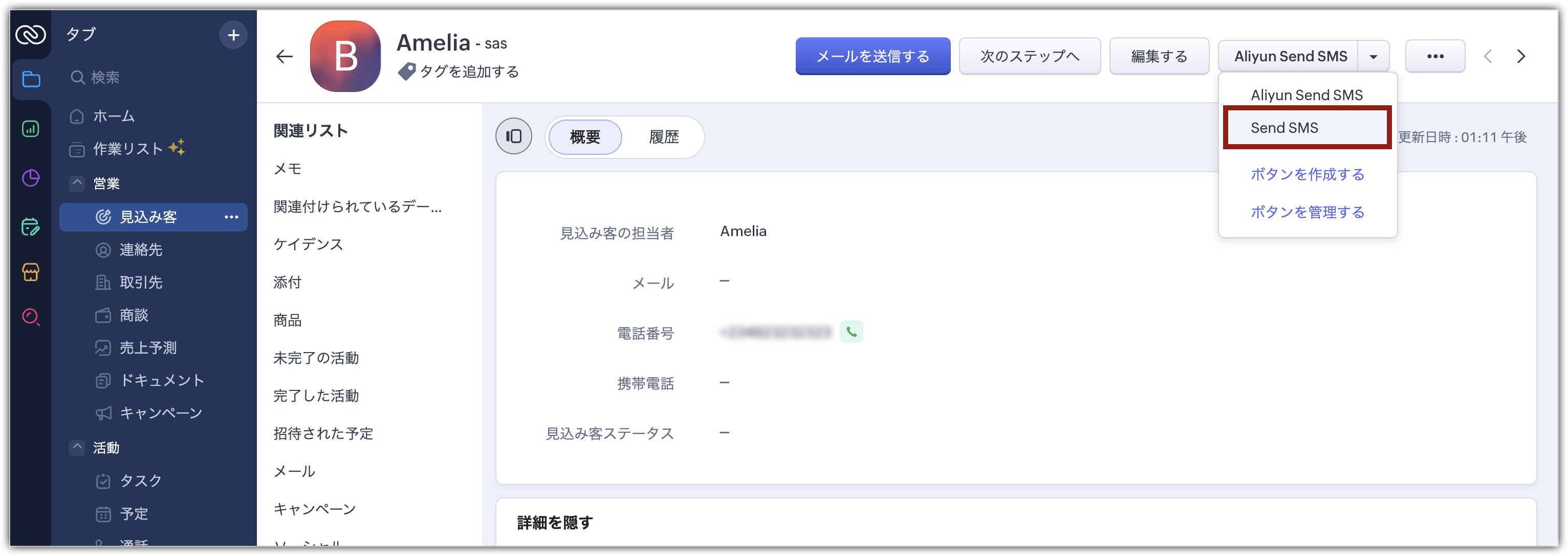 個別の見込み客/連絡先に対して送信したすべてのSMSメッセージの履歴は、関連リストの[SMS History](SMSの履歴)の項目に表示されます。