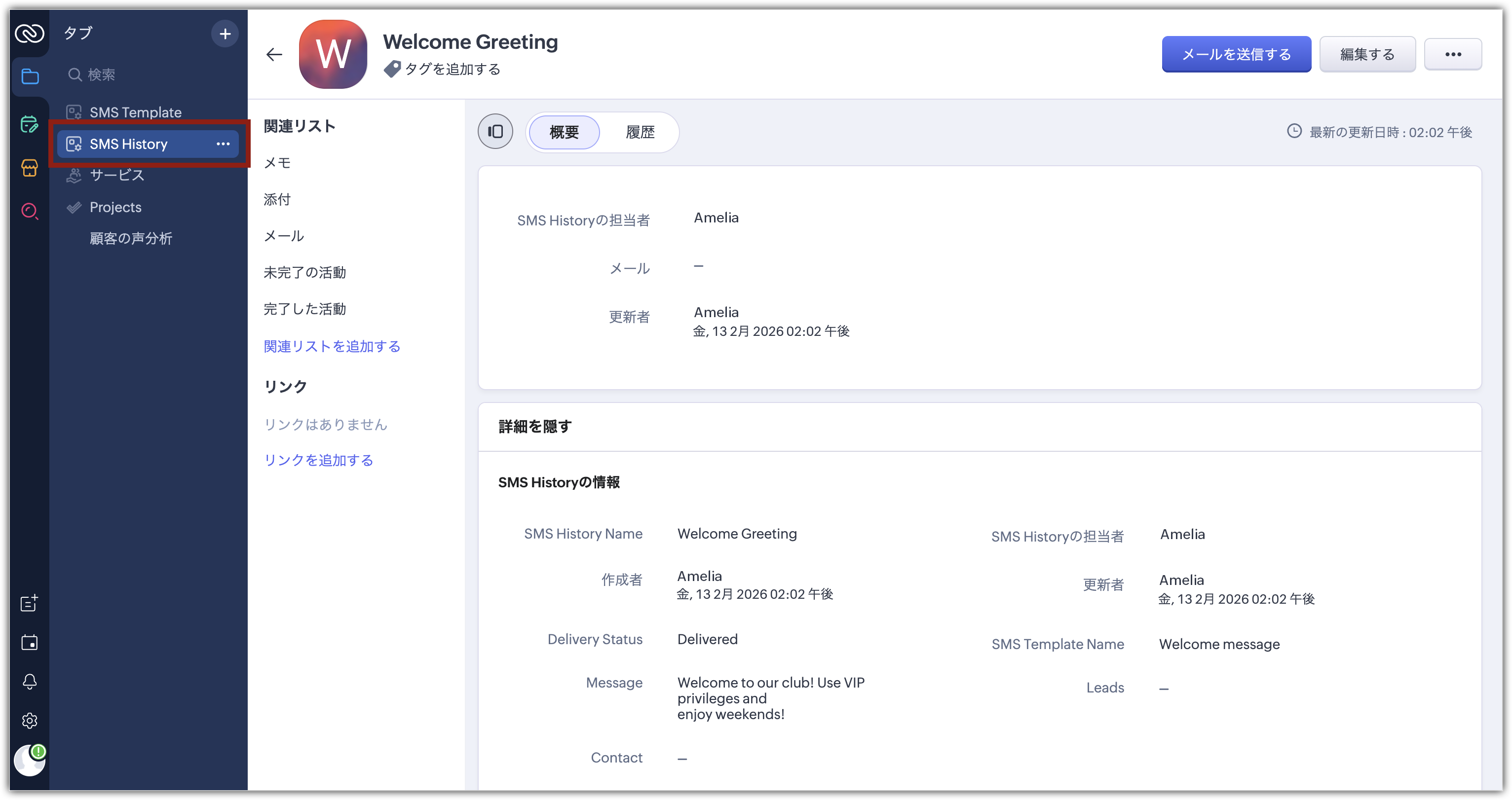 2. 見込み客/連絡先に送信されたすべてのSMSメッセージの詳細情報が、関連リストの[SMS History](SMSの履歴)の項目に表示されます。