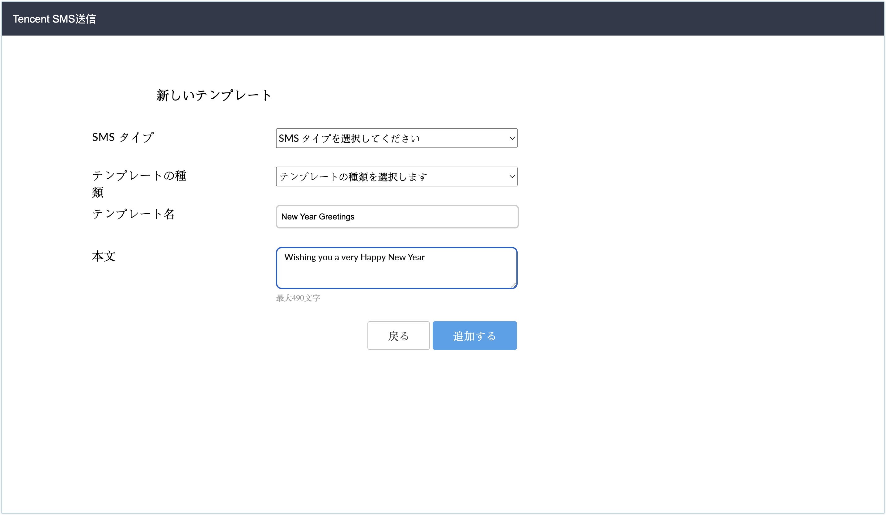TencentクラウドにはSMSテンプレートの承認プロセスがあり、SMSメッセージの送信に使用されます。新しいSMSテンプレートを作成する場合は、Tencent SMSページの[New Template](新しいテンプレート)ボタンをクリックして作成できます。