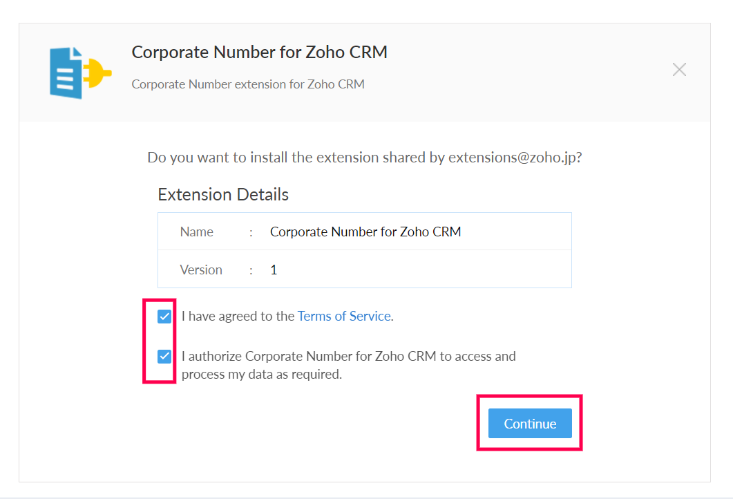 2. I authorize Corporate Number for Zoho CRM to access and process my data as required.(Zoho CRMの拡張機能によるデータへのアクセスとデータの処理を許可します。)