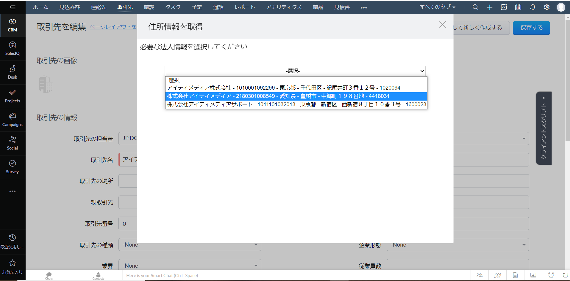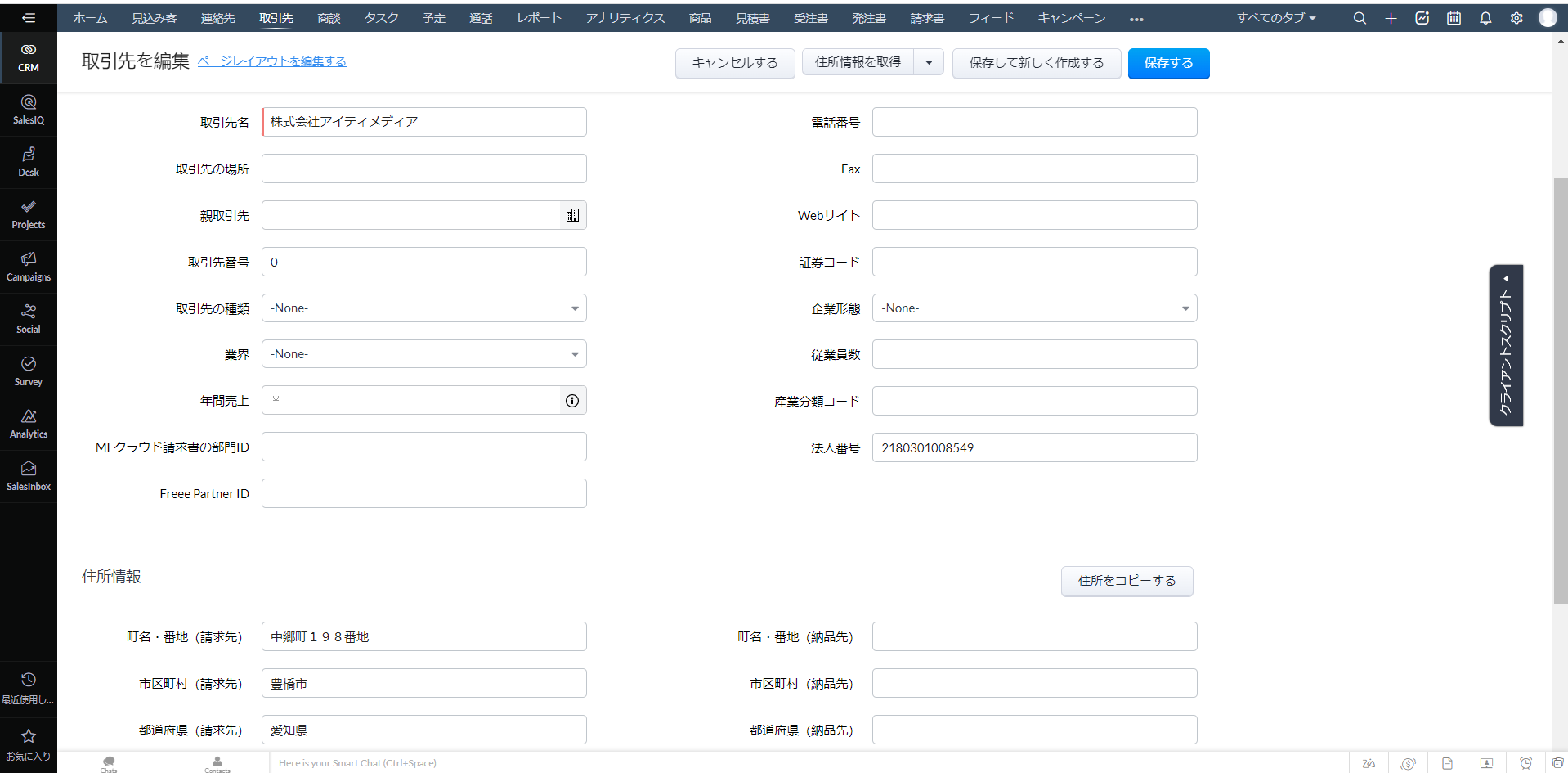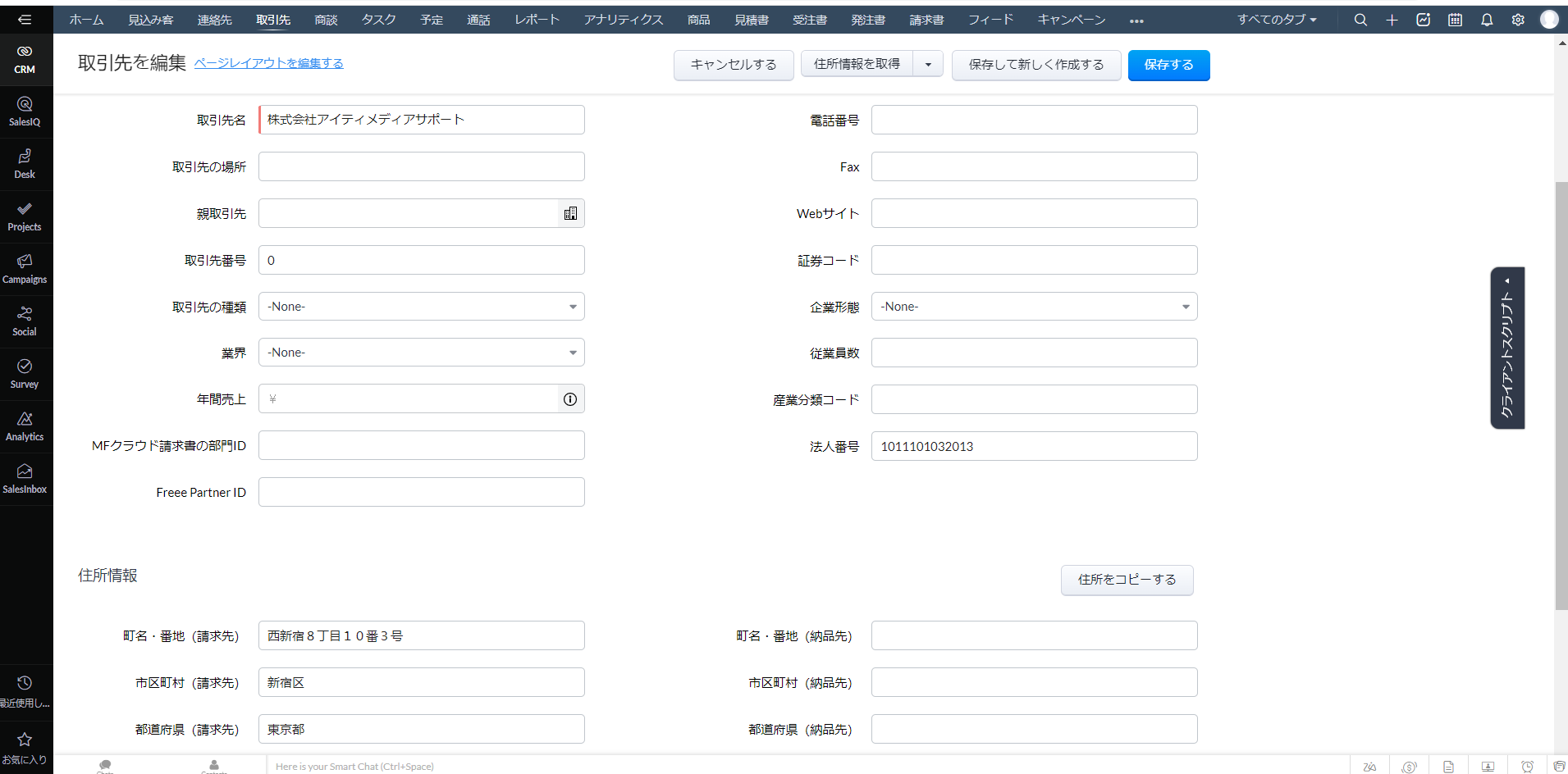 該当の取引先企業の正確な住所情報が自動的に入力されます。
