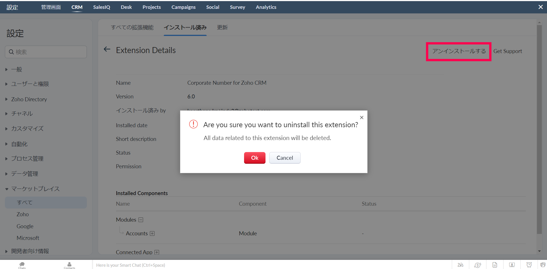 2. [Corporate Number for Zoho CRM]の拡張機能を検索し、[Uninstall](アンインストールする)をクリックします。