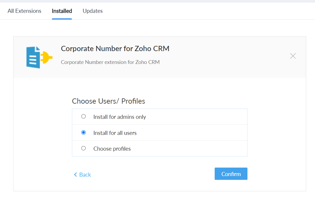 2. [All Extensions](すべての拡張機能)をクリックし、「Corporate Number for Zoho CRM」を検索して選択します。