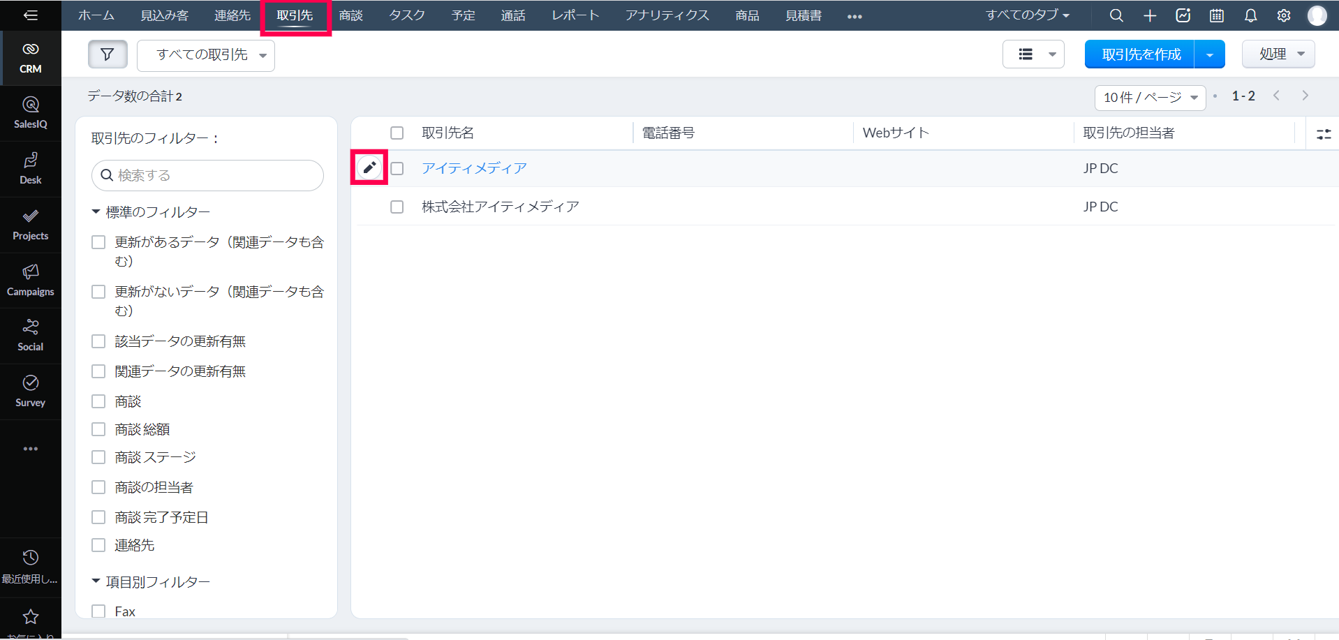 2. 対象の取引先データの左側にある鉛筆(編集)アイコンをクリックします。
