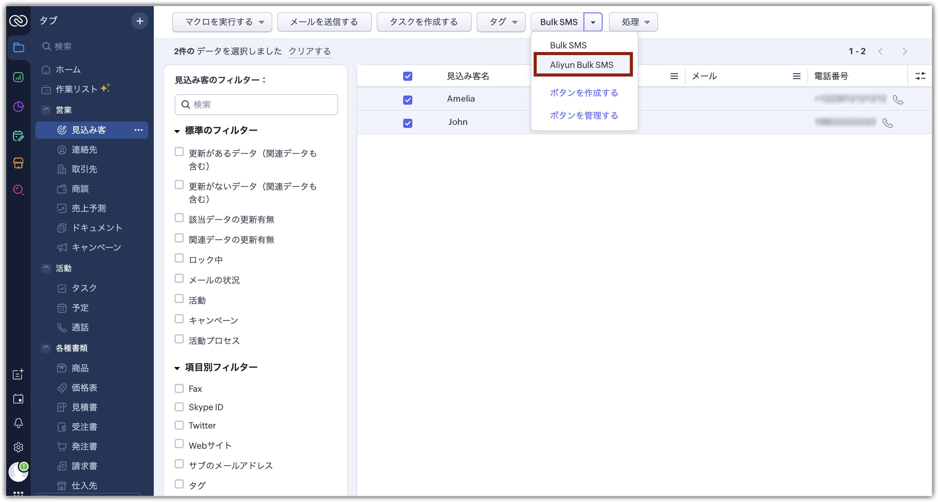 SMSメッセージを送信するにあたって、見込み客や連絡先に個別に送信するか、一括送信するか選択できます。