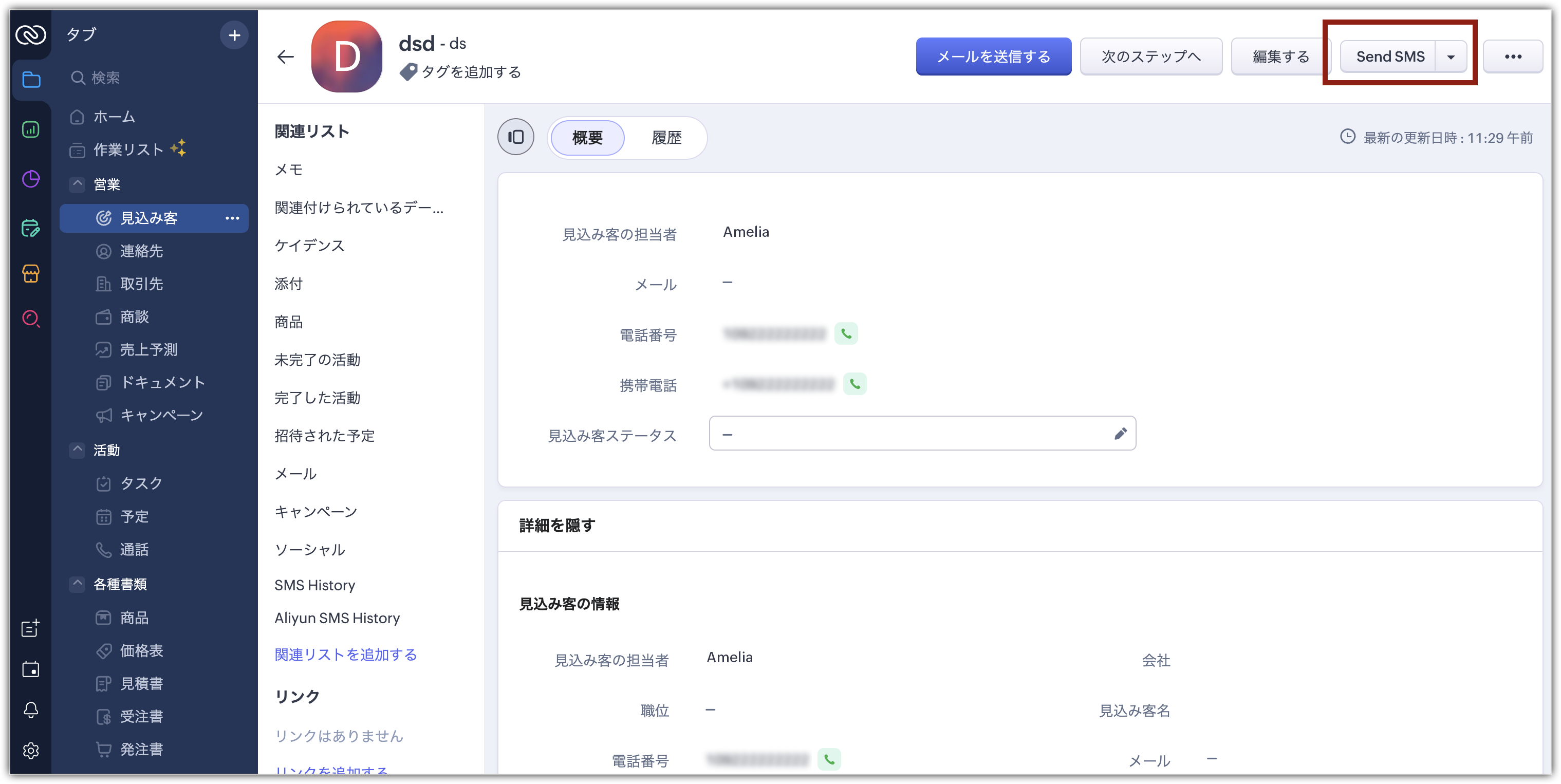 1. AliyunSMS History(AliyunSMSの履歴):見込み客や連絡先に対してSMSが送信されるたびに、このカスタムタブ内に履歴に関するデータが作成されます。