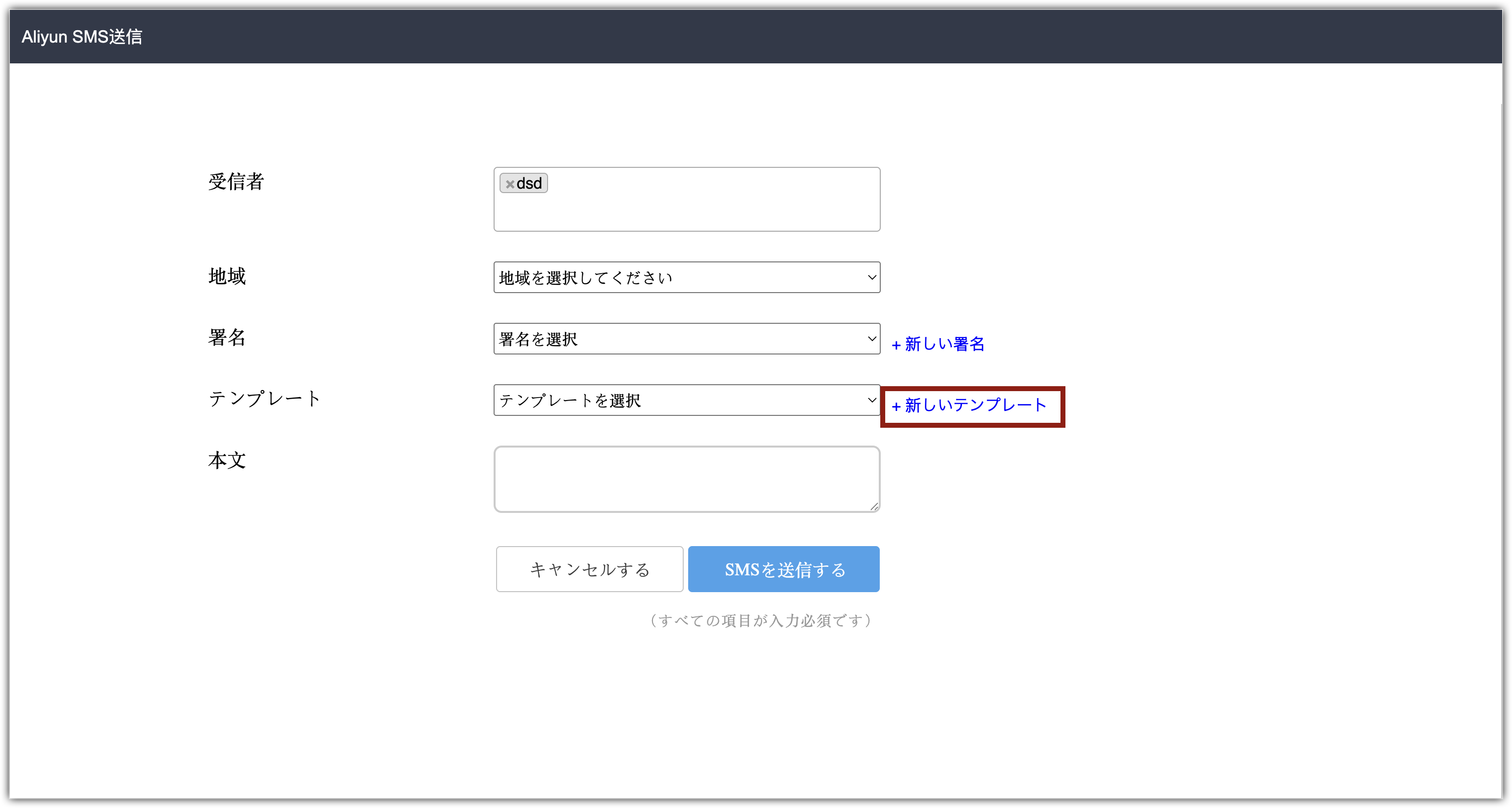 Aliyun SMSの送信ページが表示されます。