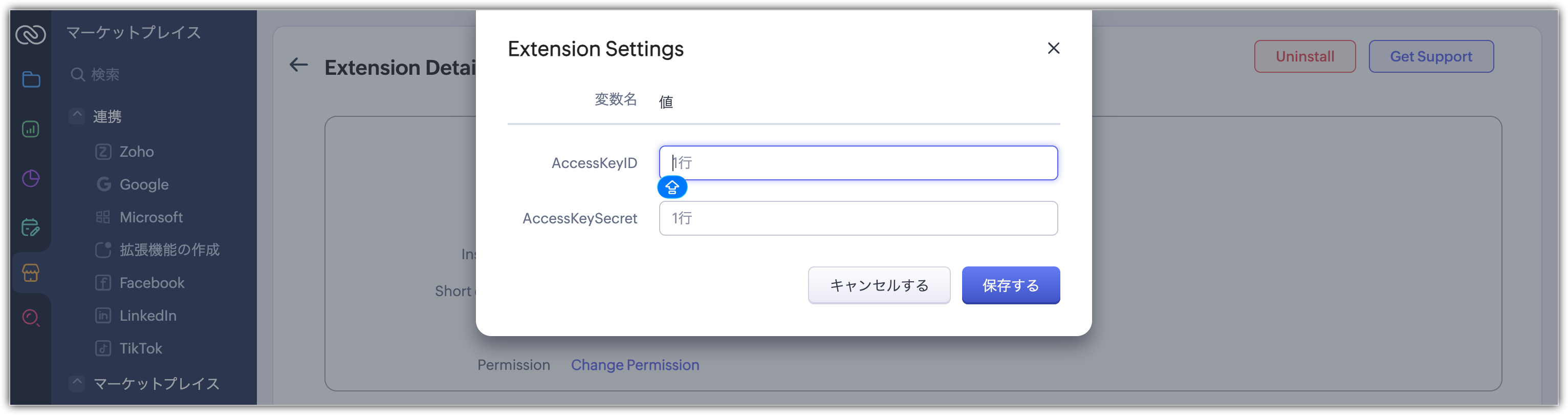 5. 表示されるポップアップ画面でAccessKeyIDAccessKeySecretを入力し、Zoho CRMでAliyun SMSアカウントを設定します。