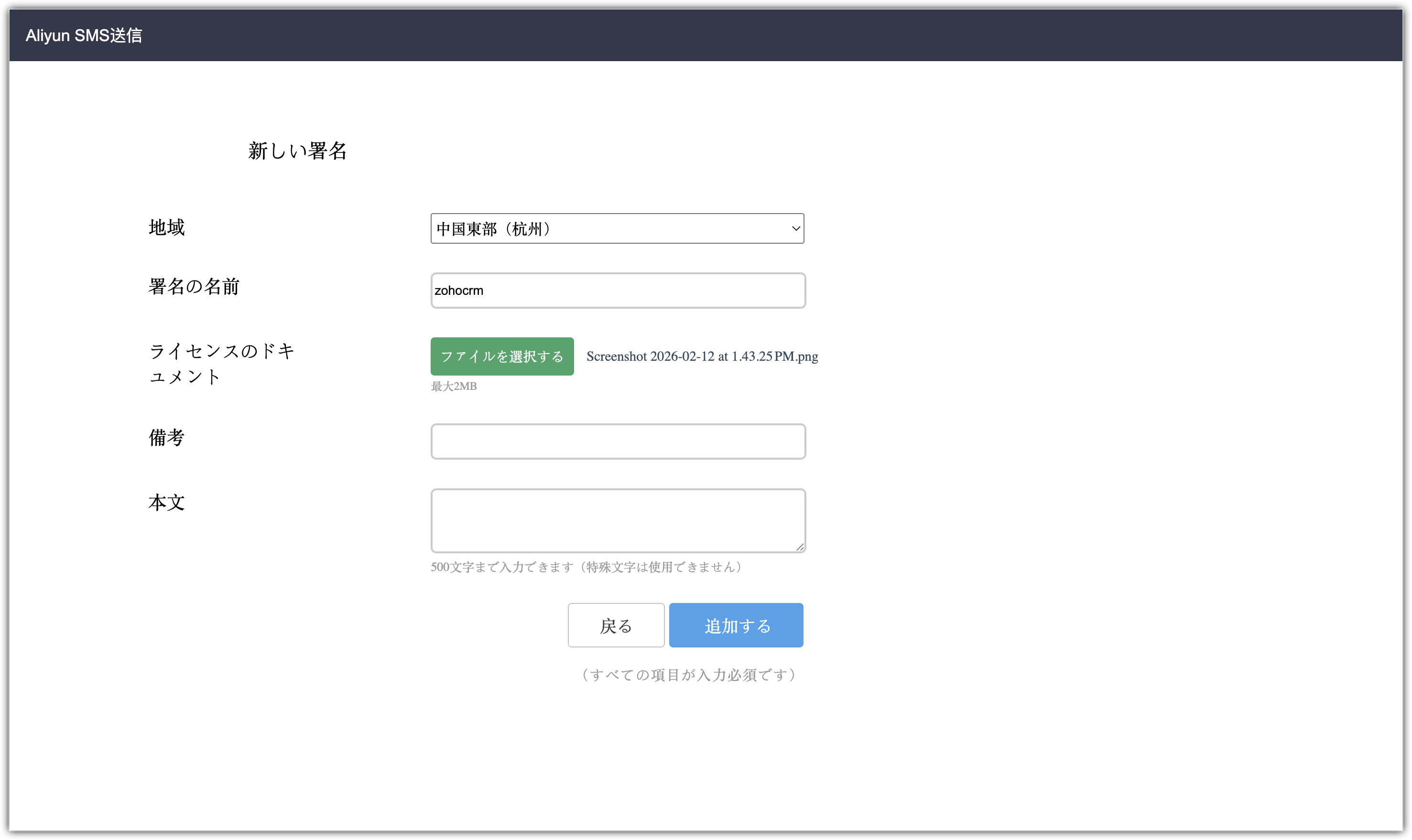 このドロップダウンには、Aliyun SMSによって承認されたすべての署名が表示されます。