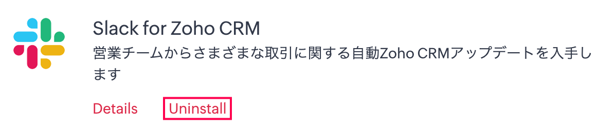 - または、[インストール済み]タブで [Slack for Zoho CRM] を見つけて、下部にある [Uninstall] (アンインストールする)リンクをクリックことで、拡張機能をアンインストールすることも可能です。