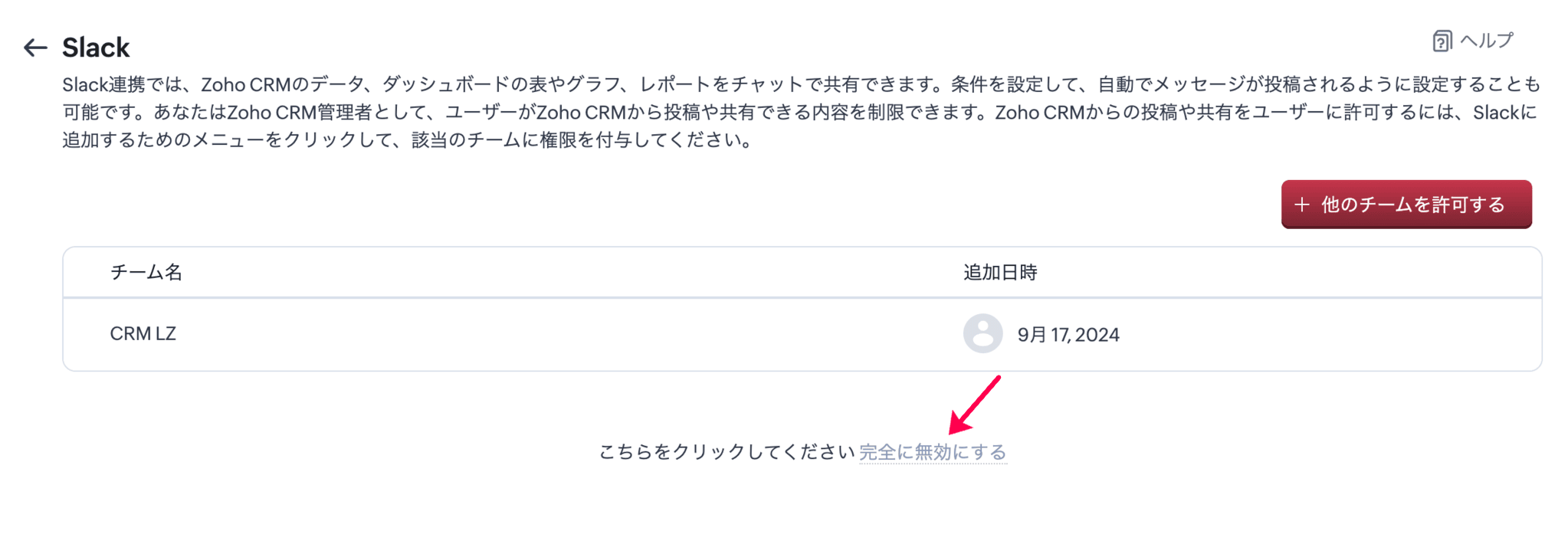 - [Slack for Zoho CRM] を見つけてクリックし、 [無効にする] ボタンをクリックします。