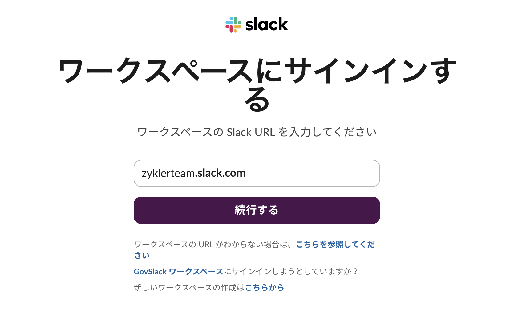 表示された画面で、 Slackのドメイン(ワークスペースのURL) を入力し、 [続行する] をクリックします。