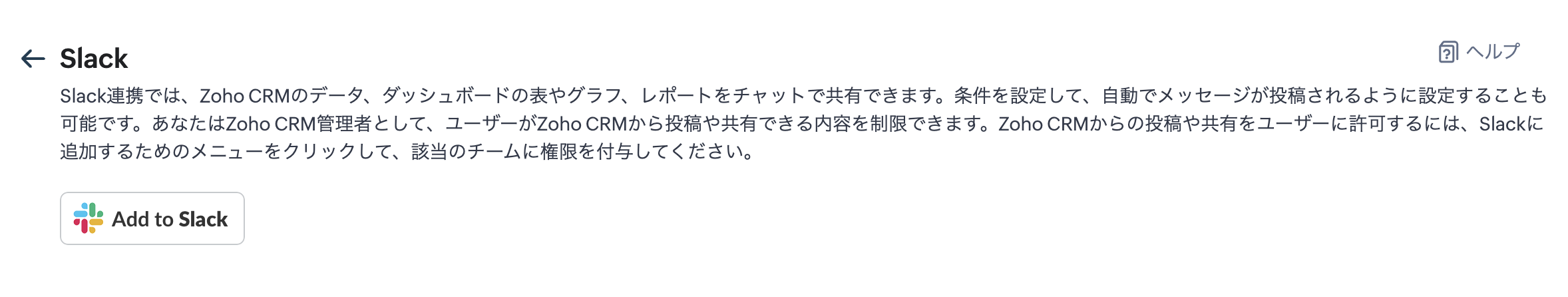 最初に、管理者がSlack拡張機能を有効にして、連携するSlackアカウントを指定して、チームを追加する必要があります。有効化後、拡張機能の設定で指定したSlackのチーム内のユーザーやチャンネルに対してのみ、Zoho CRM内のデータを共有できるようになります。