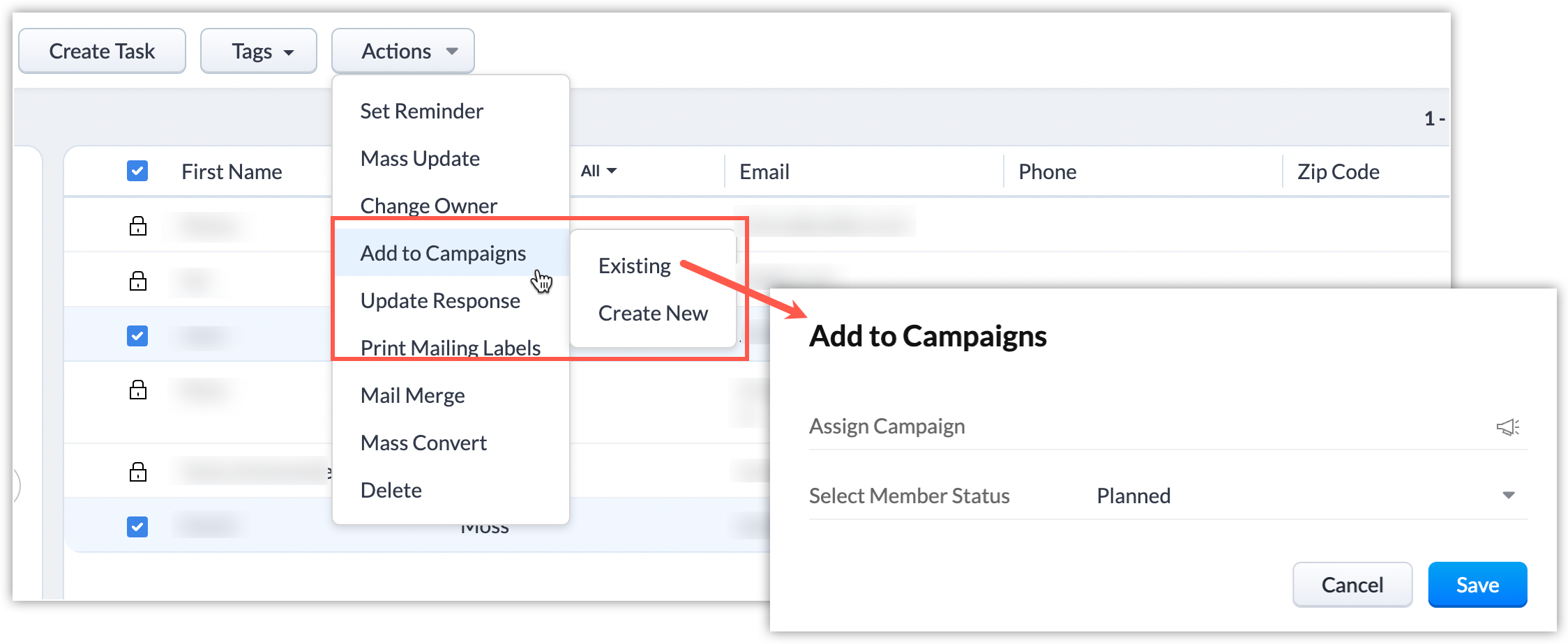 複数の見込み客に一括でキャンペーンを関連付ける方法は、次の2通りあります。1)[見込み客]タブのデータの一覧ページで、対象の見込み客データを選択し、[処理]→[キャンペーンに追加する]をクリックする。2)対象のキャンペーンの詳細ページで、[見込み客]の関連リストから、対象の見込み客データを選択して関連付ける。